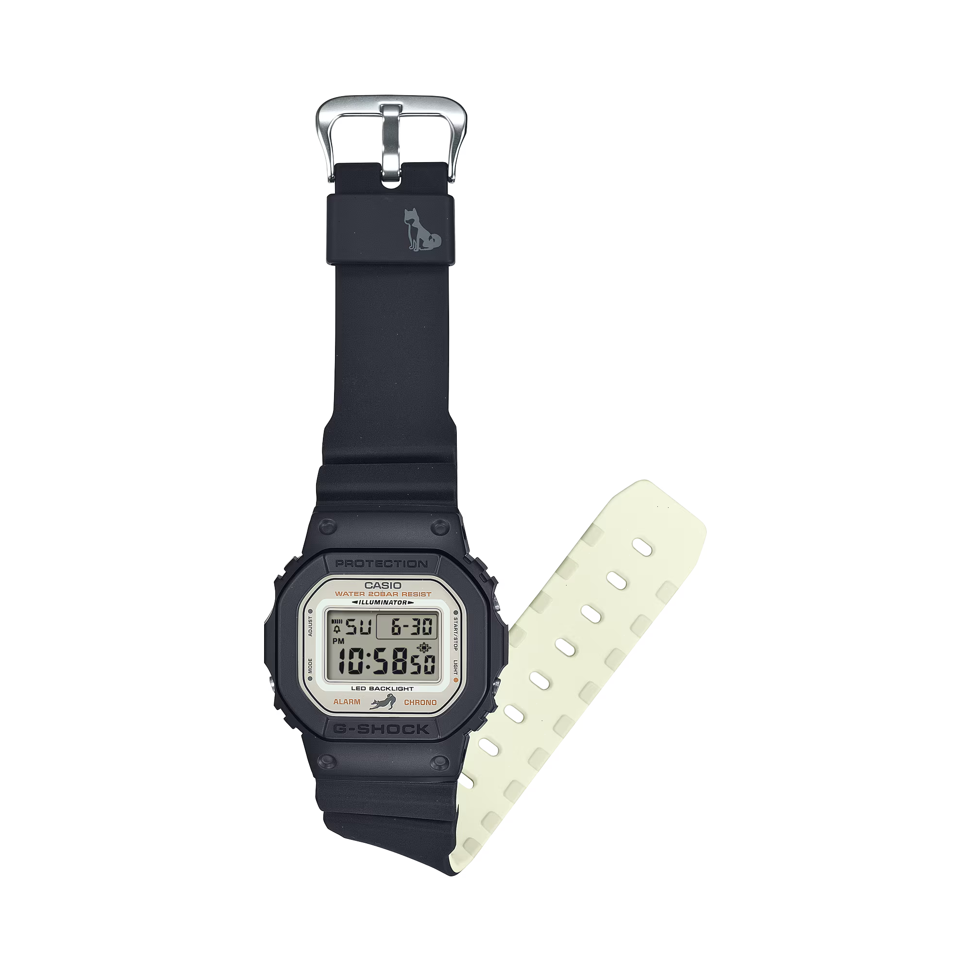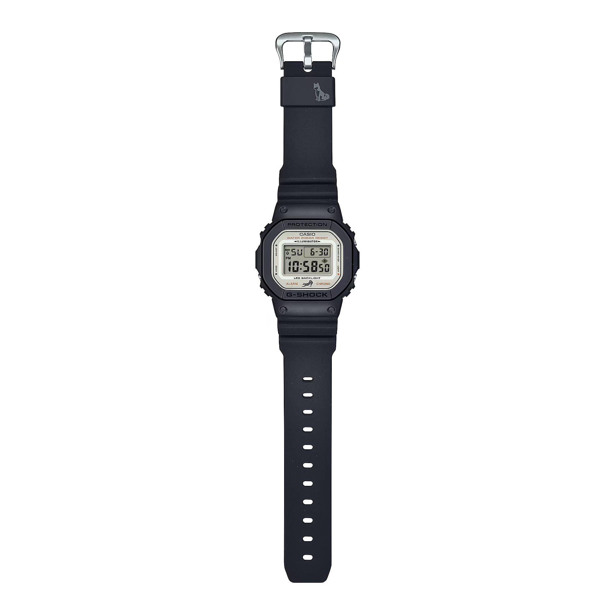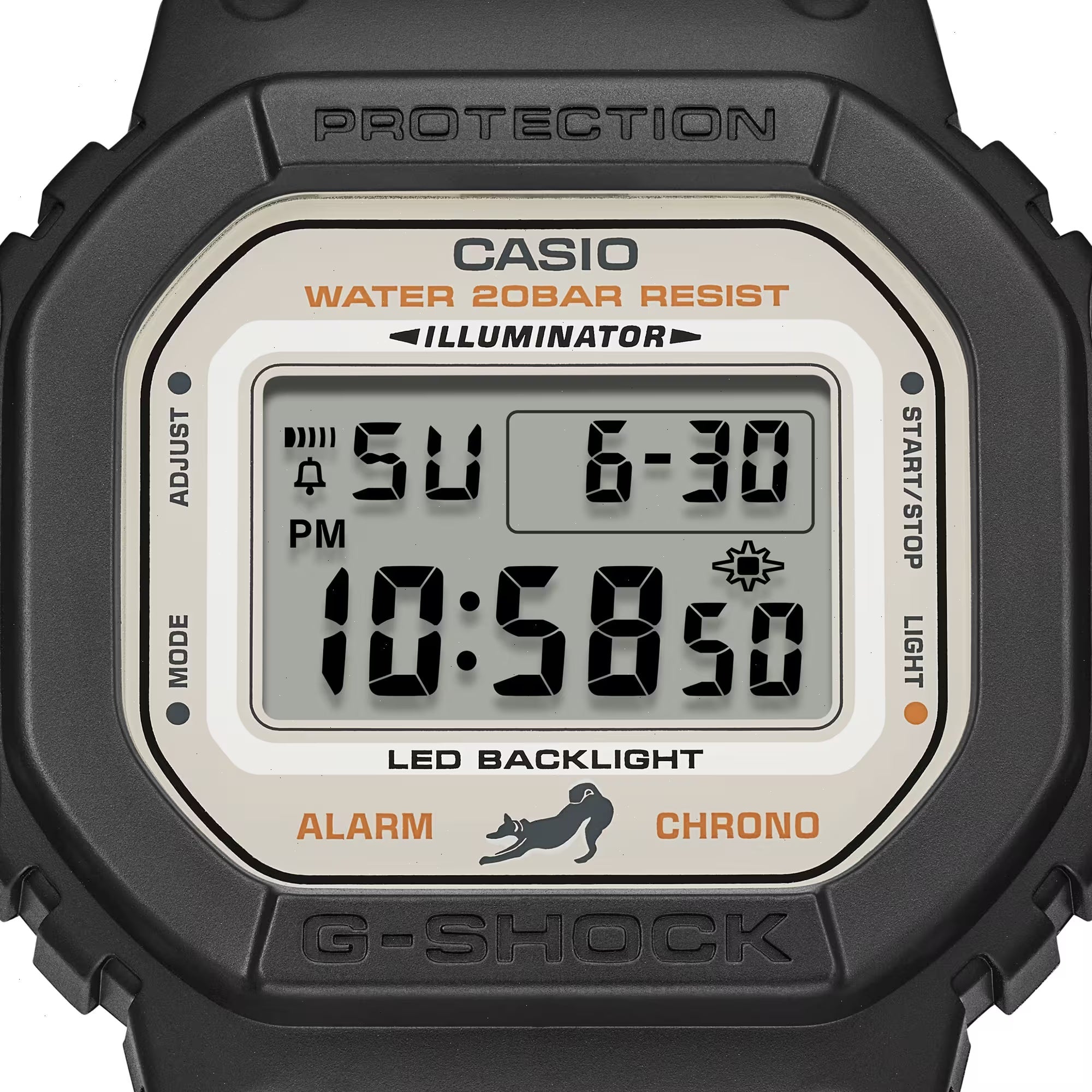 DW-5600SHB: The black Kuro-Shiba comes alive with a black bezel and dual-color black band with off-white underside evoking the countershading of this Shiba Inu coat. Press the light button to see a closeup image of the dog’s face on the display. The design features a full-body silhouette on the dial, case back, and band loop, as well.