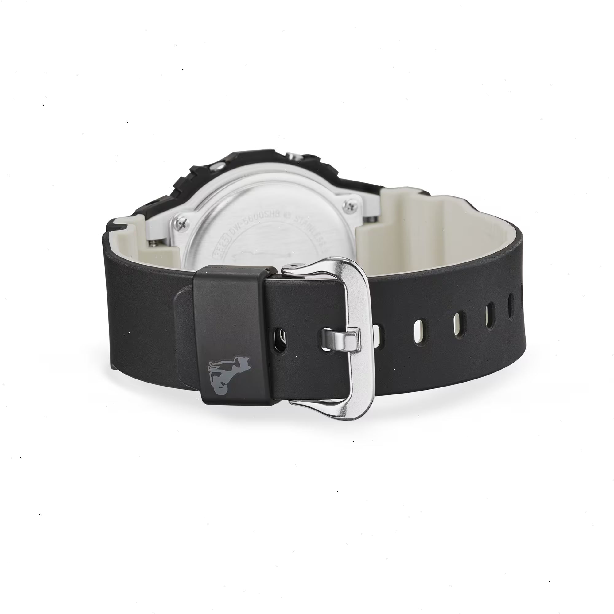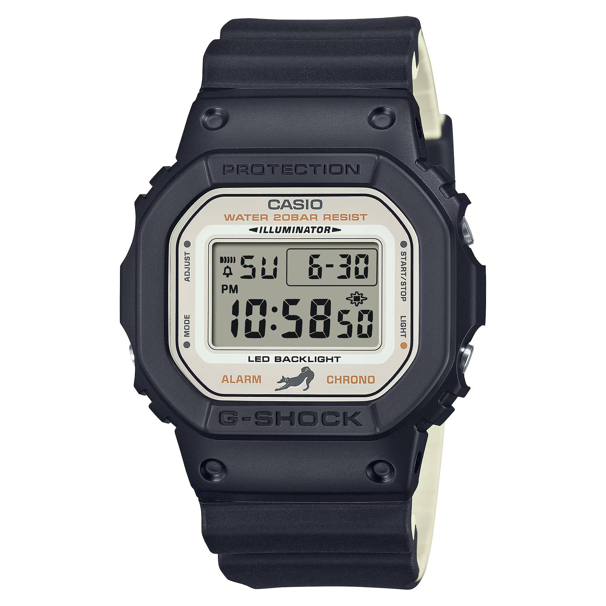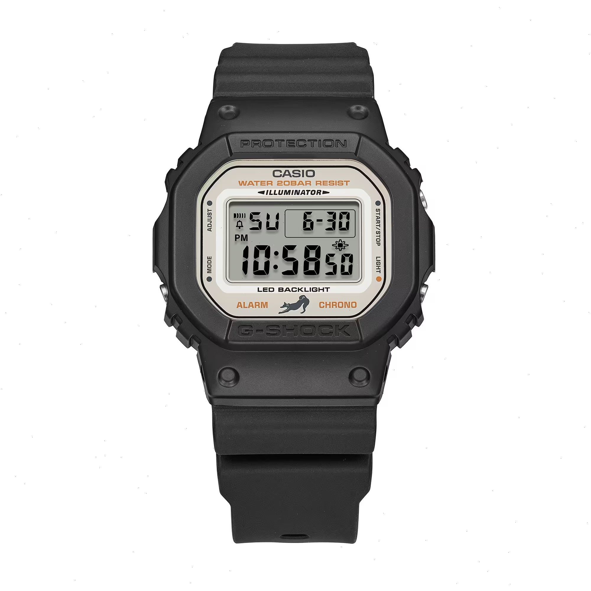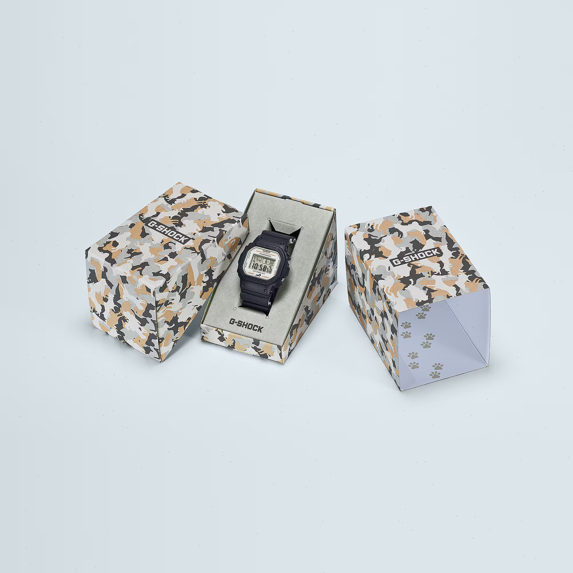 DW-5600SHB: The black Kuro-Shiba comes alive with a black bezel and dual-color black band with off-white underside evoking the countershading of this Shiba Inu coat. Press the light button to see a closeup image of the dog’s face on the display. The design features a full-body silhouette on the dial, case back, and band loop, as well.