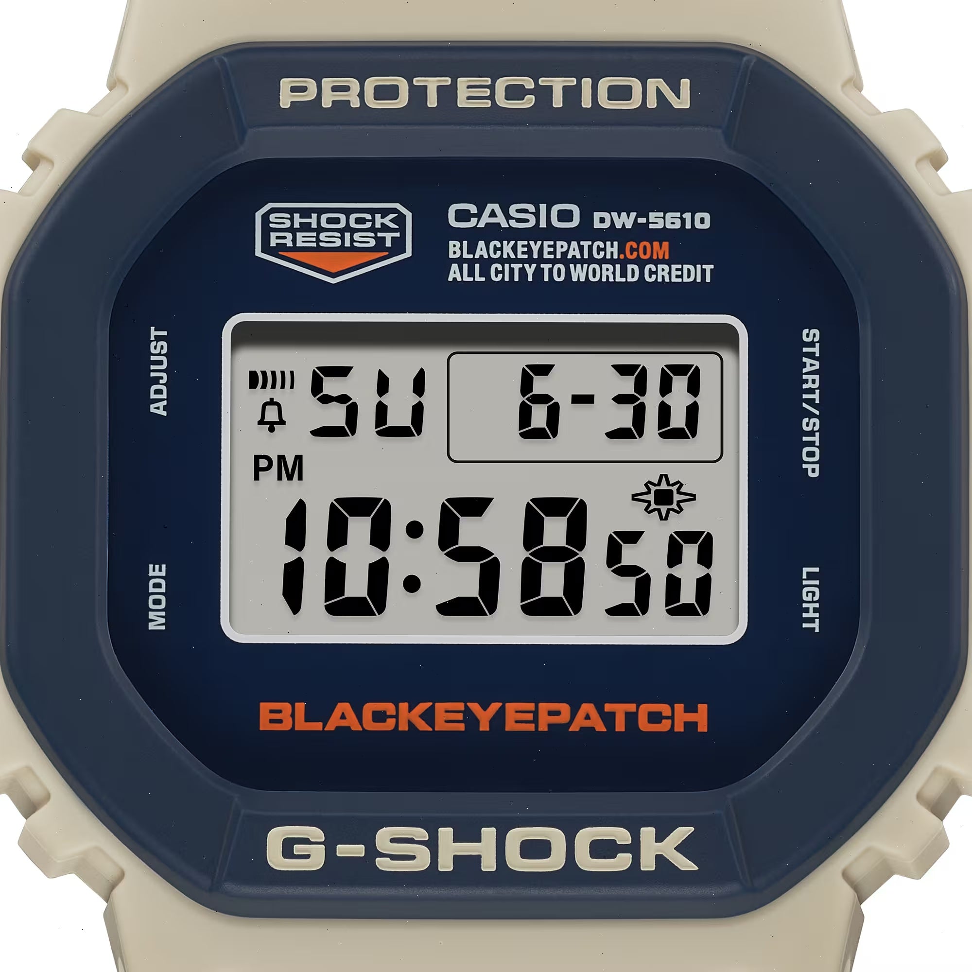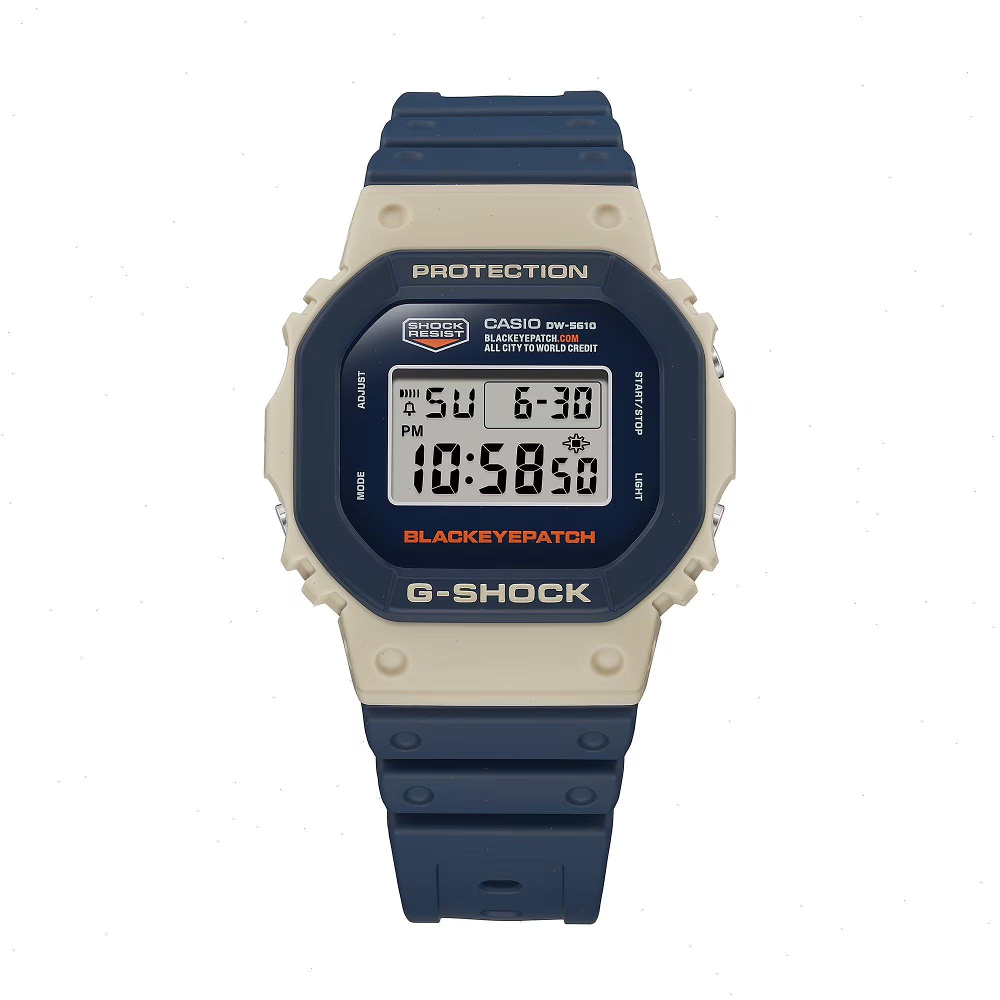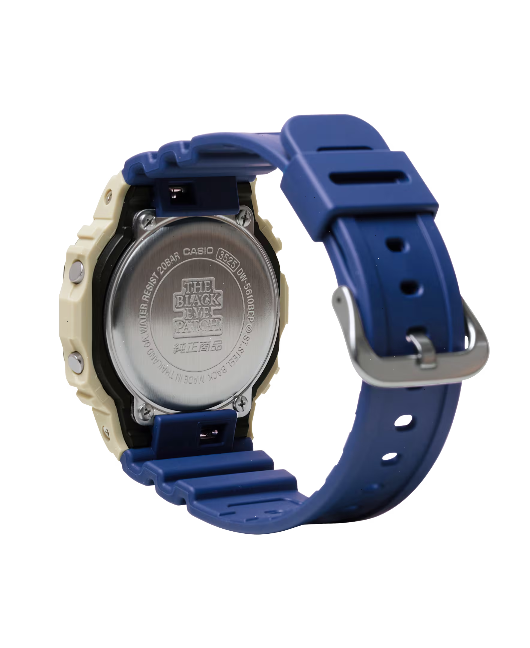 Based on the DW5610, heir to the iconic shape of the very first G-SHOCK, this latest collaboration features an industrial design teeming with BlackEyePatch* brand graphic elements. Base colors of navy and beige are accented with a touch of orange, a color often used in workwear. The Tokyo street brand’s 純正商品 (“Genuine Article”) tag is etched on the case back, and also revealed backlit on the display when you press the light button.