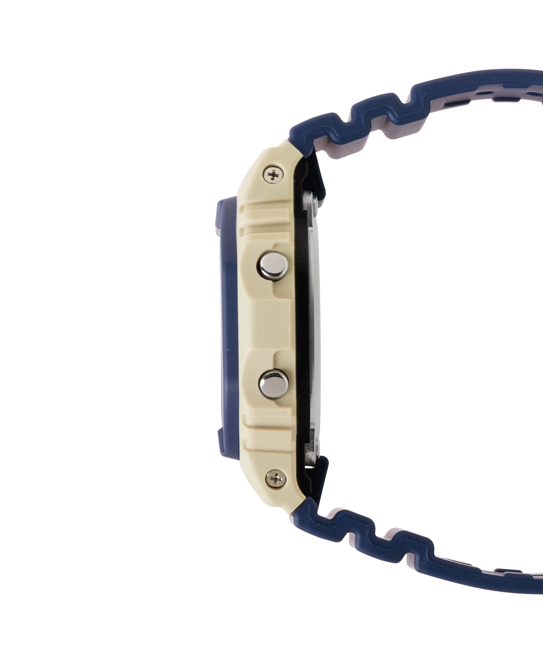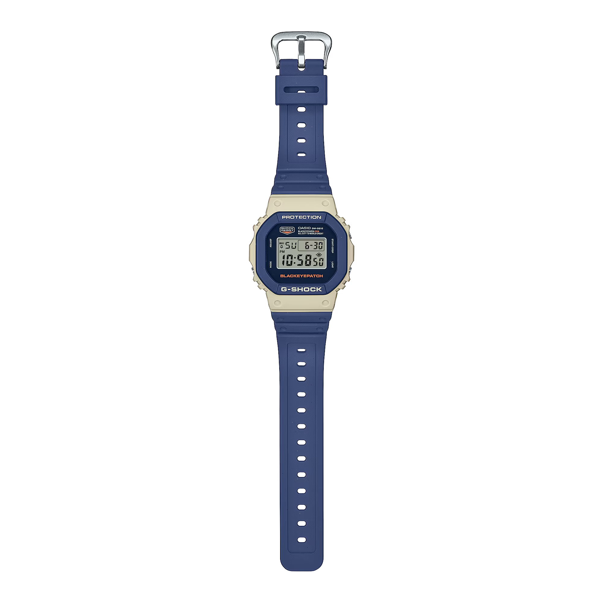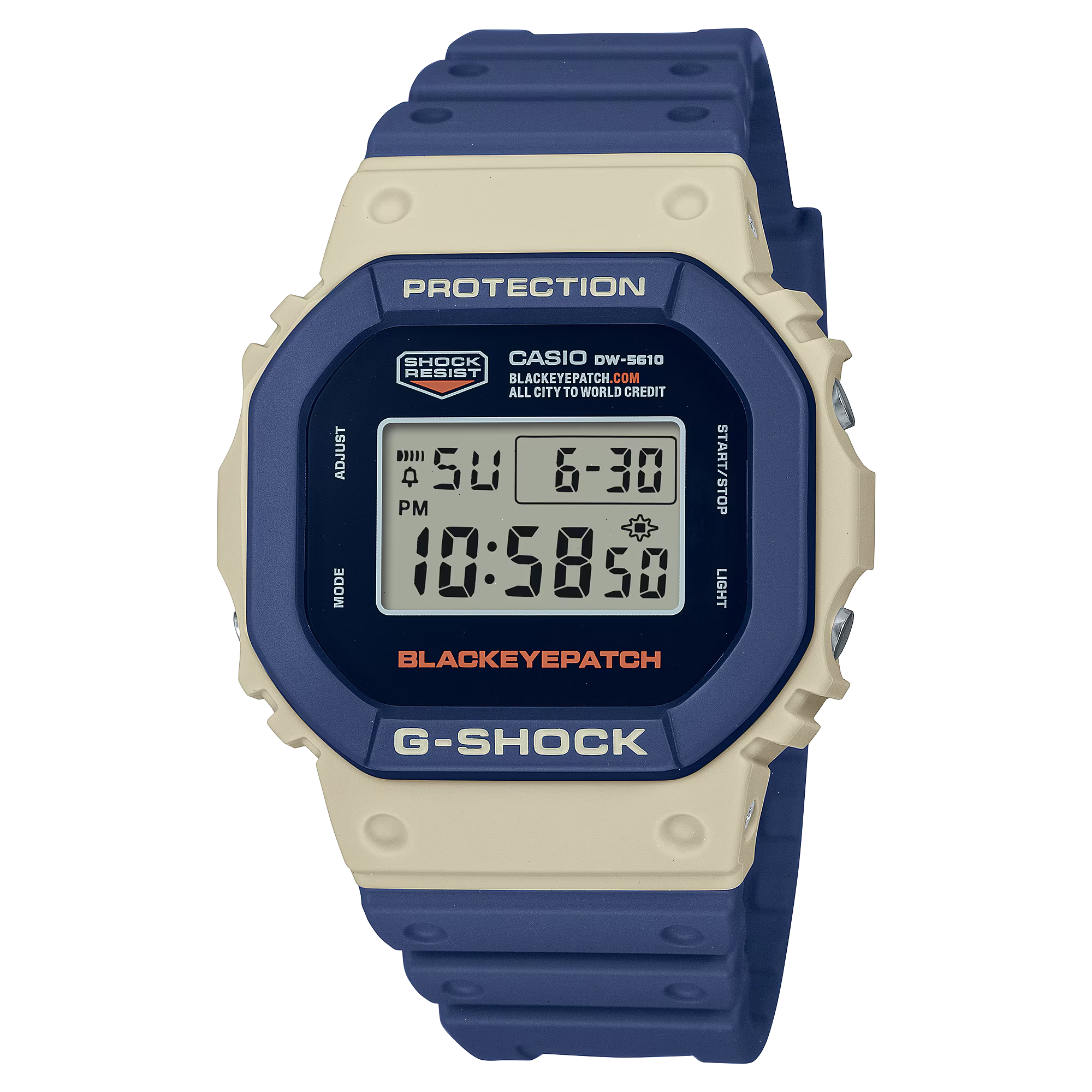 Based on the DW5610, heir to the iconic shape of the very first G-SHOCK, this latest collaboration features an industrial design teeming with BlackEyePatch* brand graphic elements. Base colors of navy and beige are accented with a touch of orange, a color often used in workwear. The Tokyo street brand’s 純正商品 (“Genuine Article”) tag is etched on the case back, and also revealed backlit on the display when you press the light button.