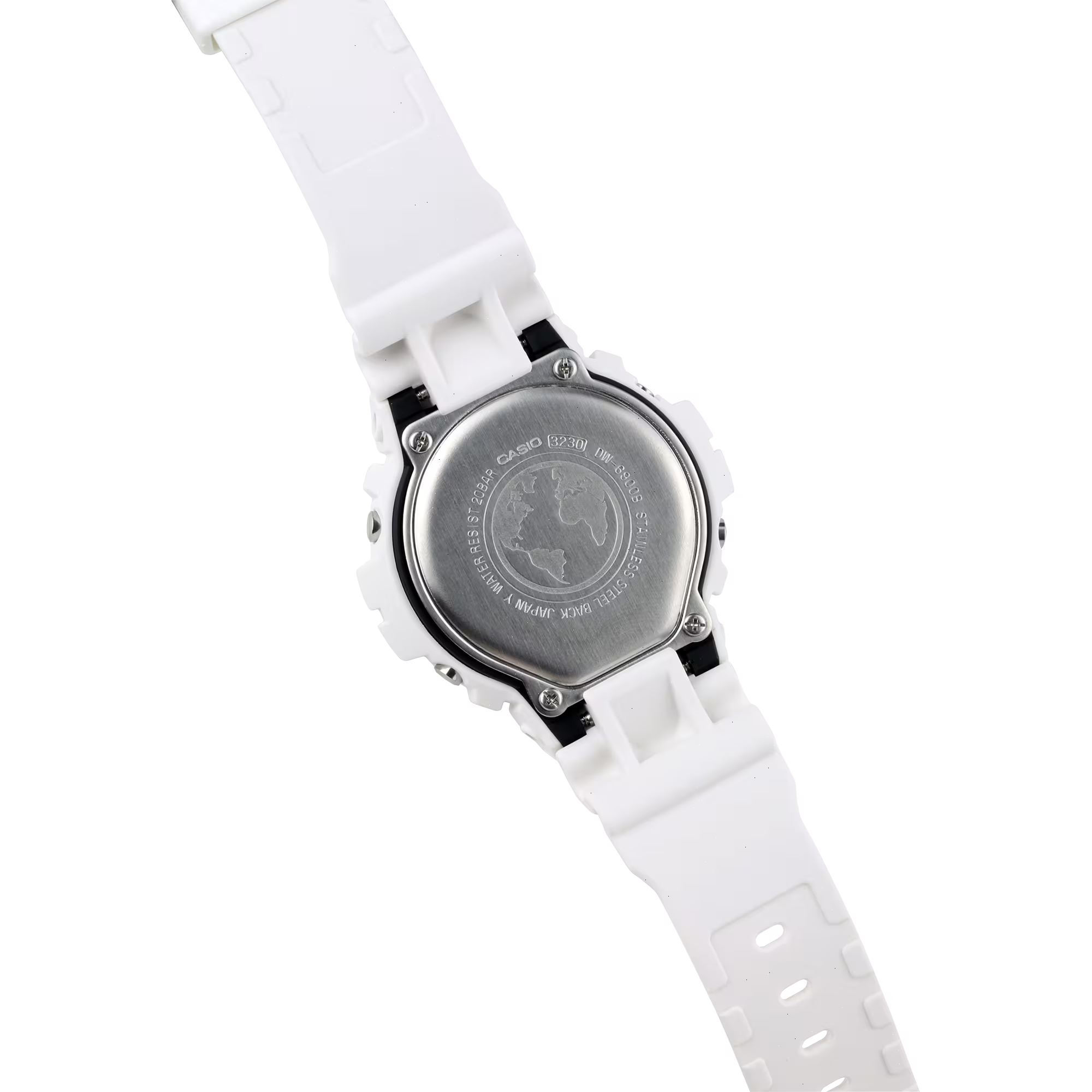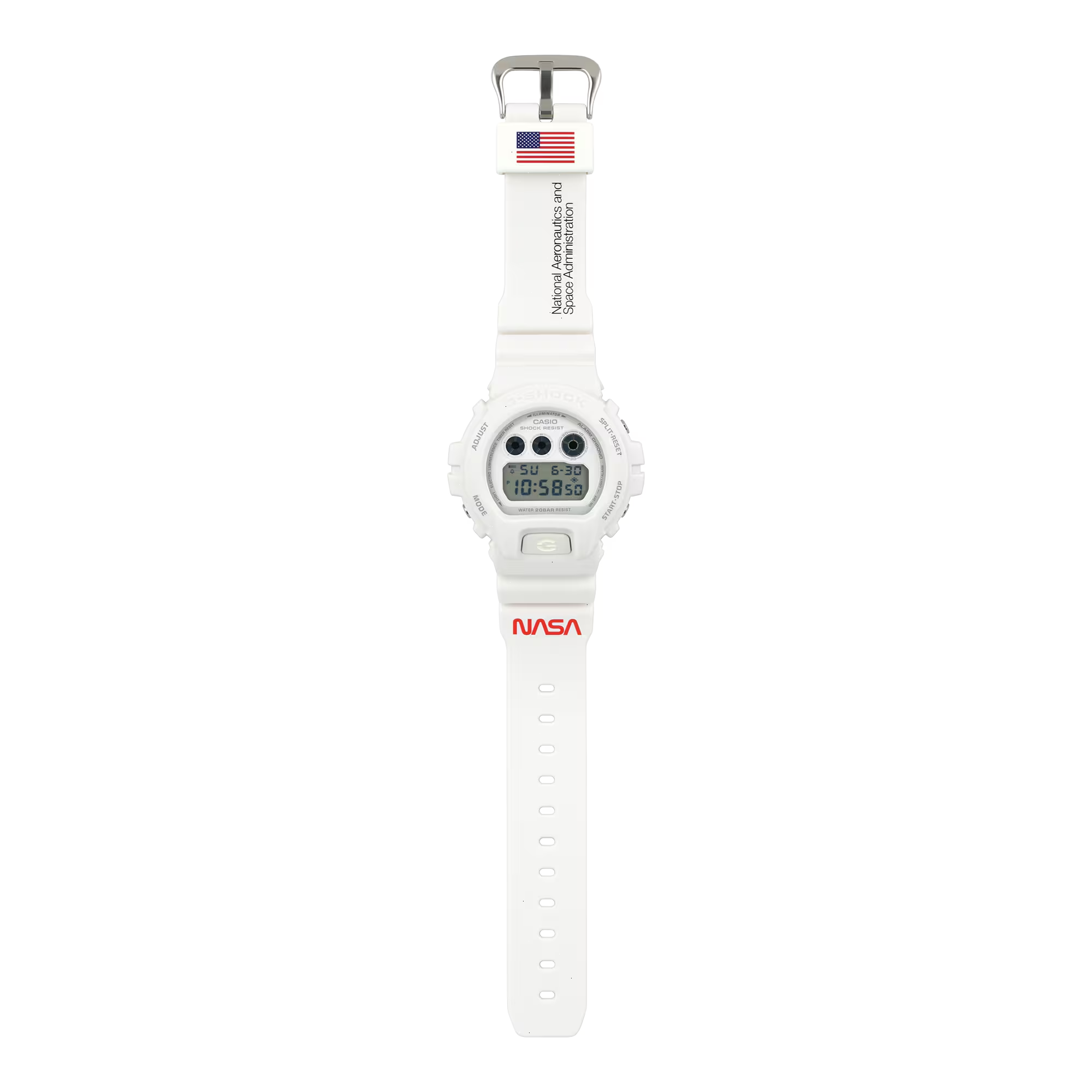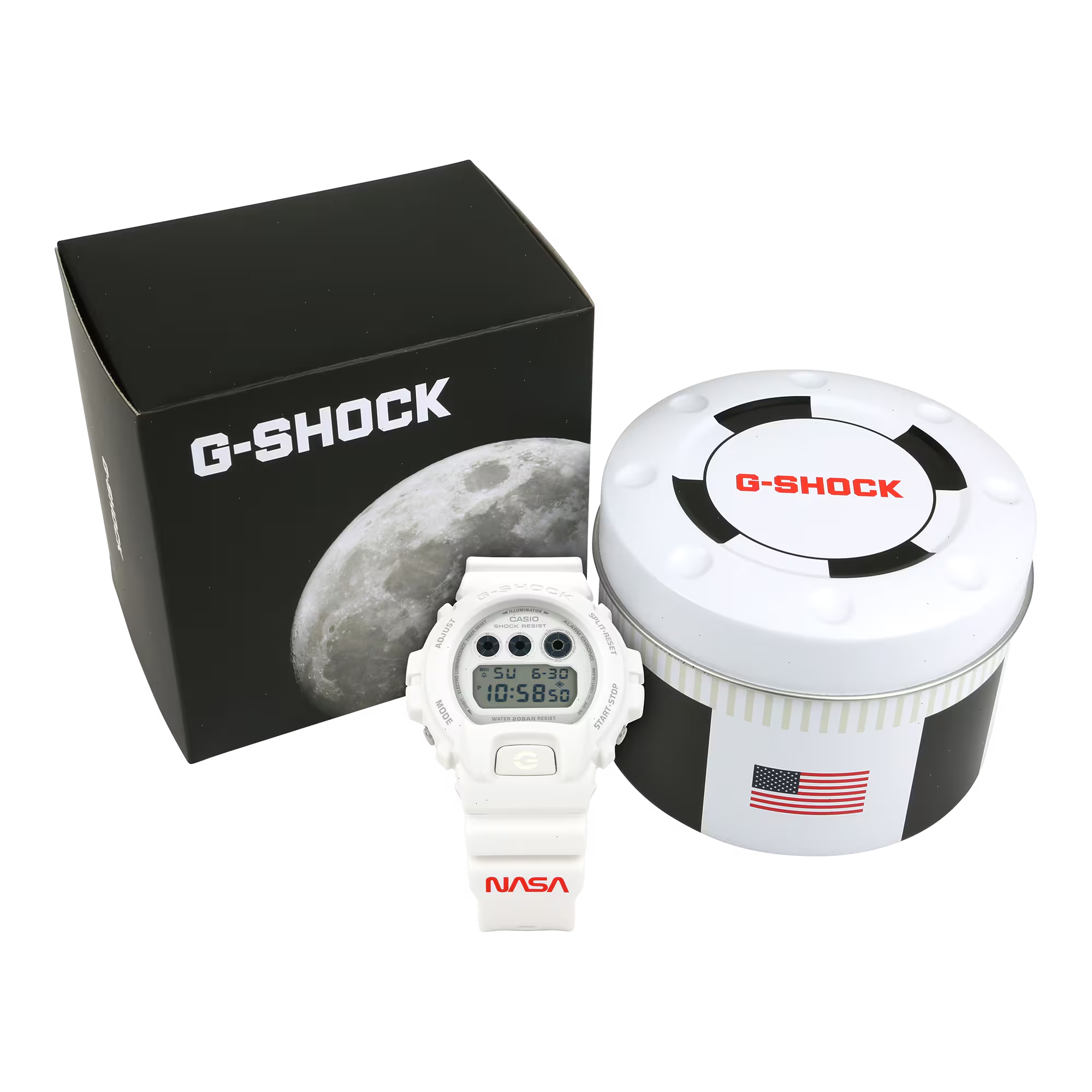Sporting a crisp, matte white finish, the DW6900NASA237 features a full resin case, bezel, and band, making for a minimalistic yet bold look on the wrist. To further commemorate the brand, the timepiece displays the NASA logo on the lower band and “National Aeronautics and Space Administration” on the upper band. Additionally, an American flag can be found on the band loop and a depiction of the Earth is engraved on the case back, as well as appearing in the watch face when the EL backlight is activated. Lastly, as with many limited-edition models, the watch comes in special packaging that features an outer box with the moon set against a semi-matte black background and an inner tin of black and white, emblazoned with the American flag and the brand’s logo.