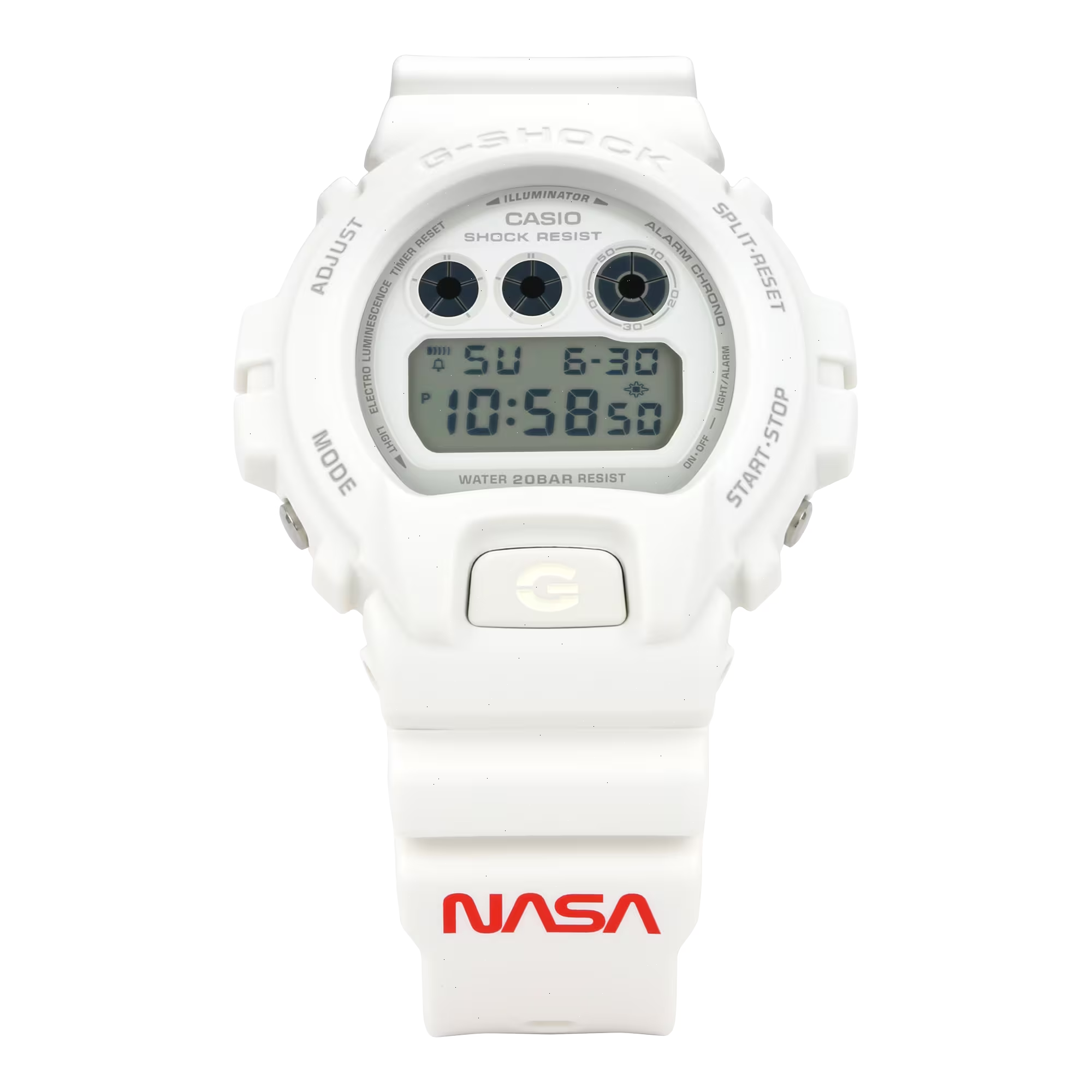 The DW6900NASA237 comes to life through the classic and timeless design of the rounded DW6900, which was first introduced in 1995 and has gone on to become a cultural icon with era-spanning popularity. In celebration of its 40th anniversary, G-SHOCK unites fans of both brands and pays homage to a beloved and influential style, inviting enthusiasts to come together and revel in the distinctive aura of this new timepiece.