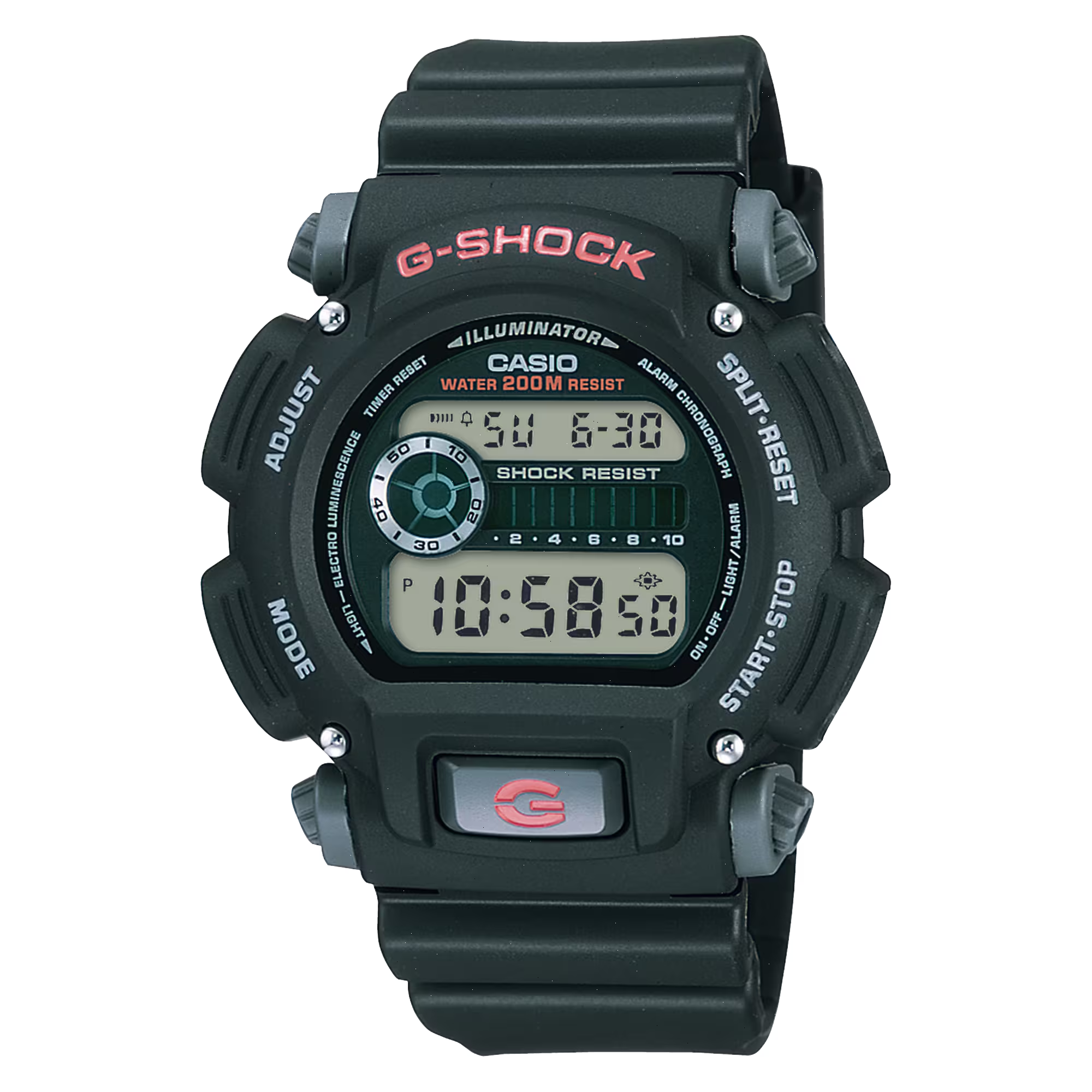 With full 200M WR, Shock Resistant, 24Hr stopwatch and countdown timer, standard issue never looked this good. Black resin band digital watch with black face.