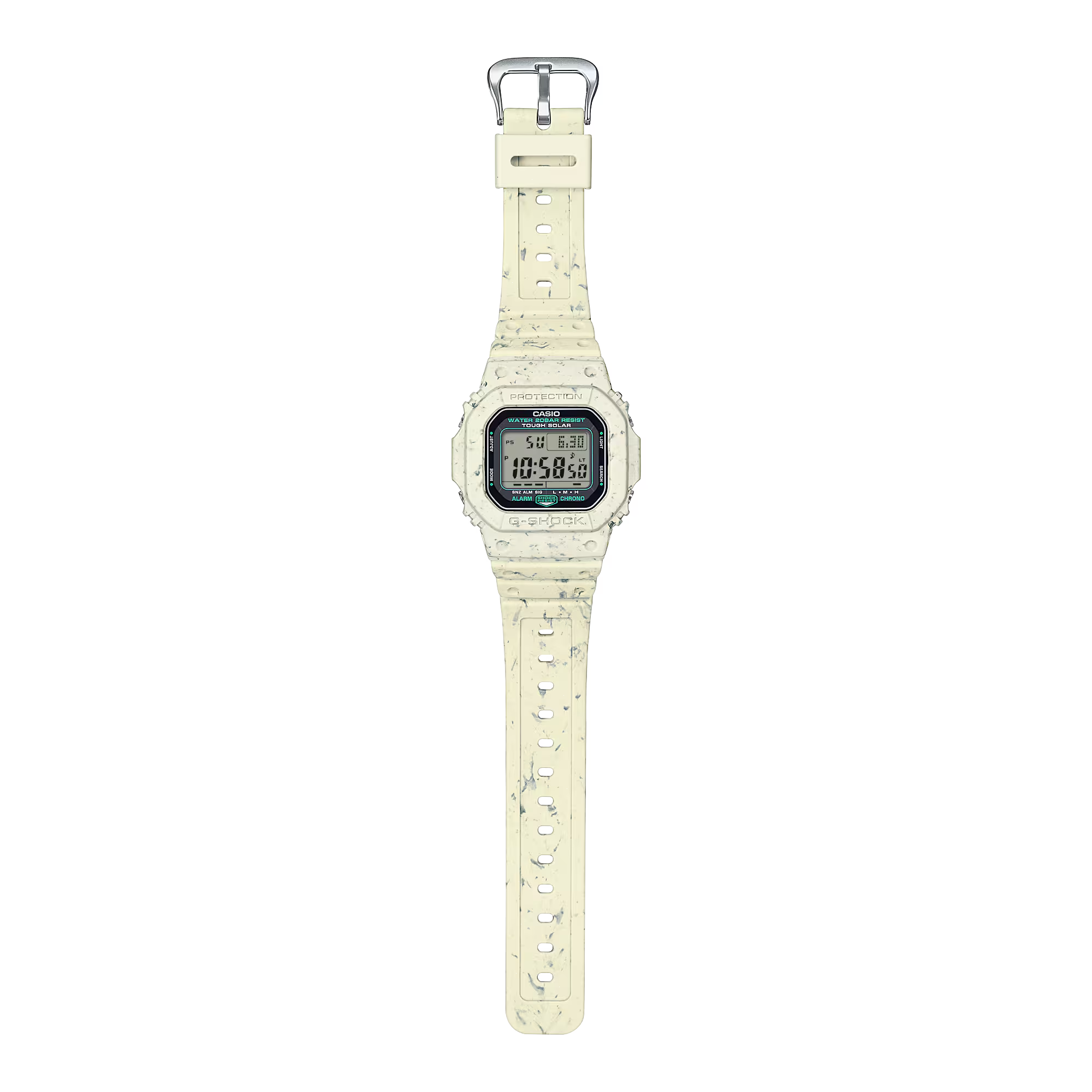 The G5600BG-5 makes the most of resin left over from the manufacture of components for other watches. Waste resin in white and olive green is powdered and kneaded into a beige base, creating a special design with a unique, subtly colorful pattern that will take you wherever you want to go — from everyday fun to fashionable occasions.