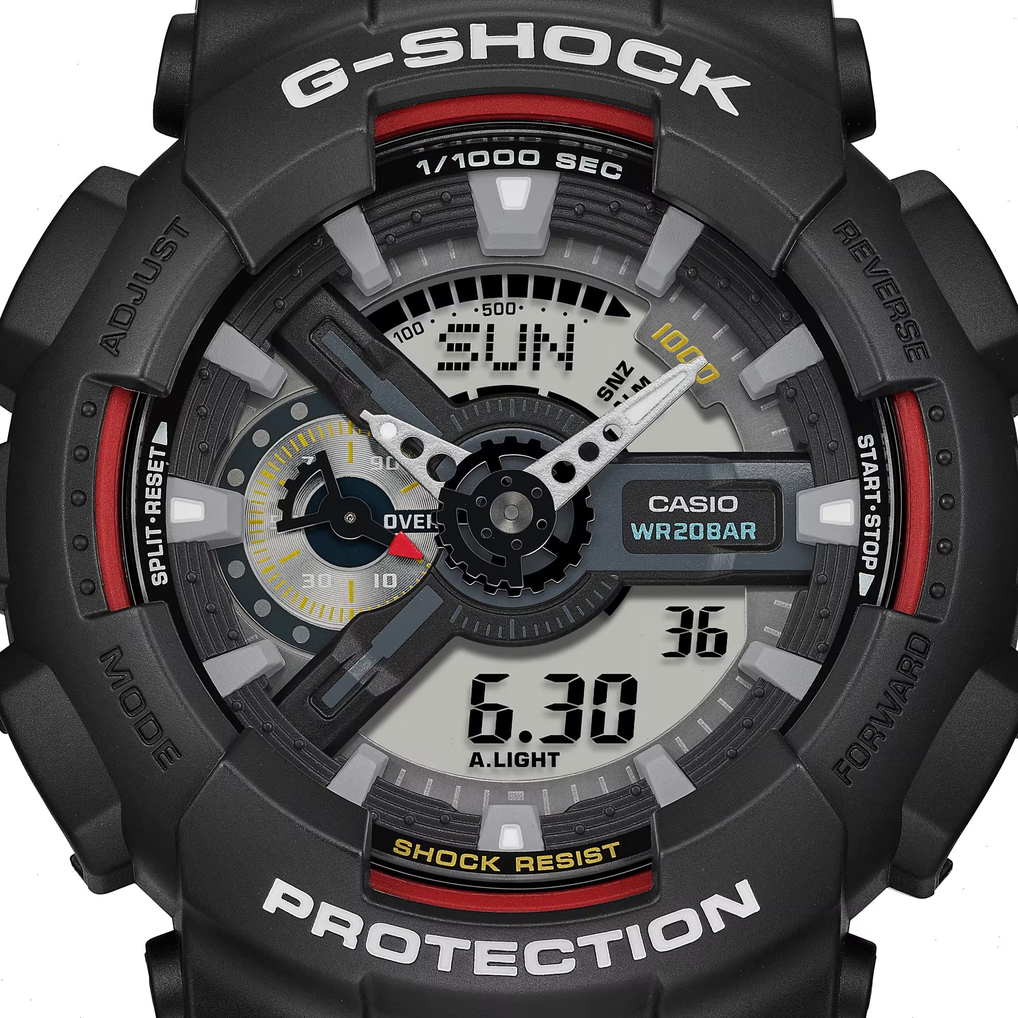 A stand-out with distinctive large case. The original color scheme is faithfully reproduced with touches of G-SHOCK red, representing the passion to take on challenges; blue, symbolizing excellent water resistance; and yellow, signifying outstanding shock resistance.