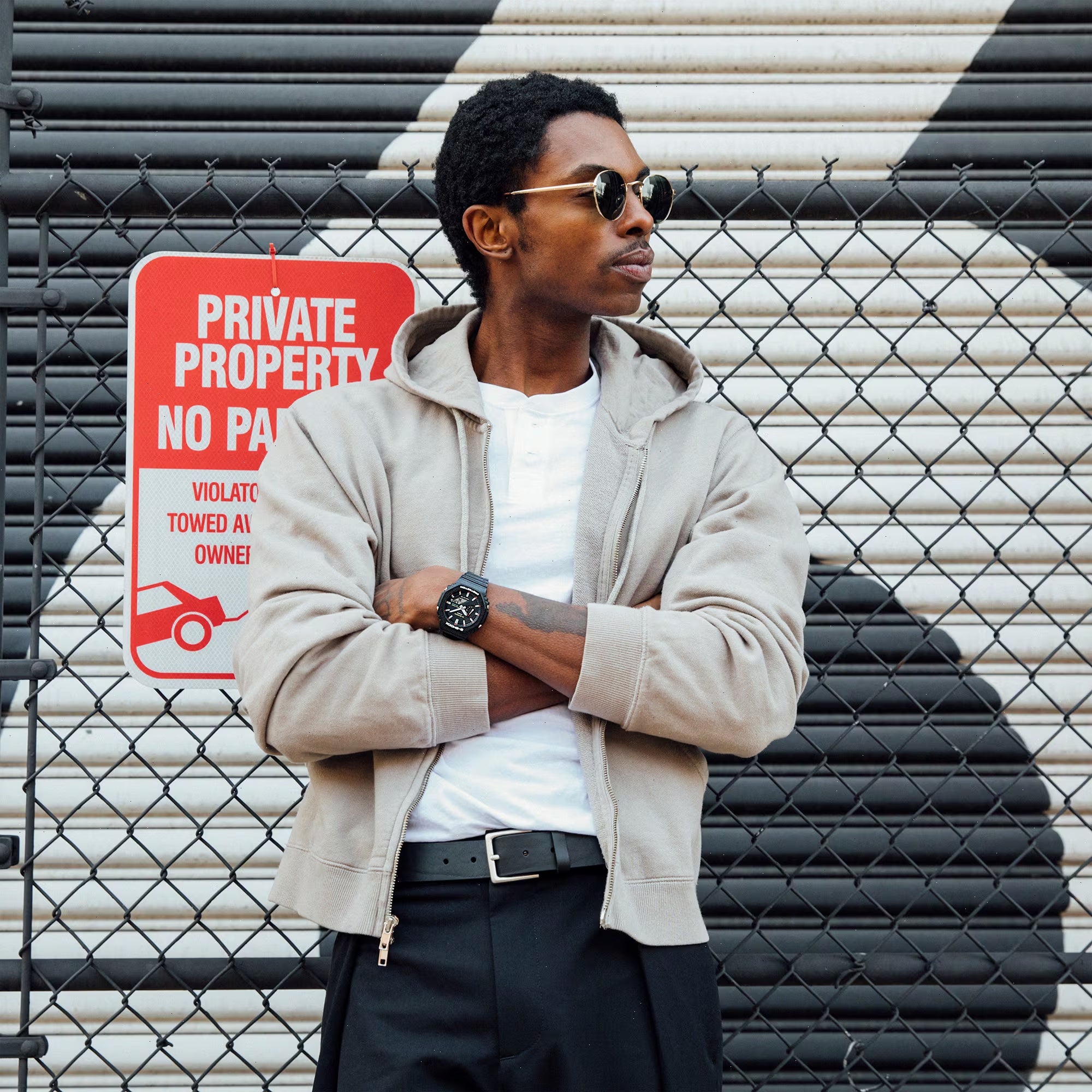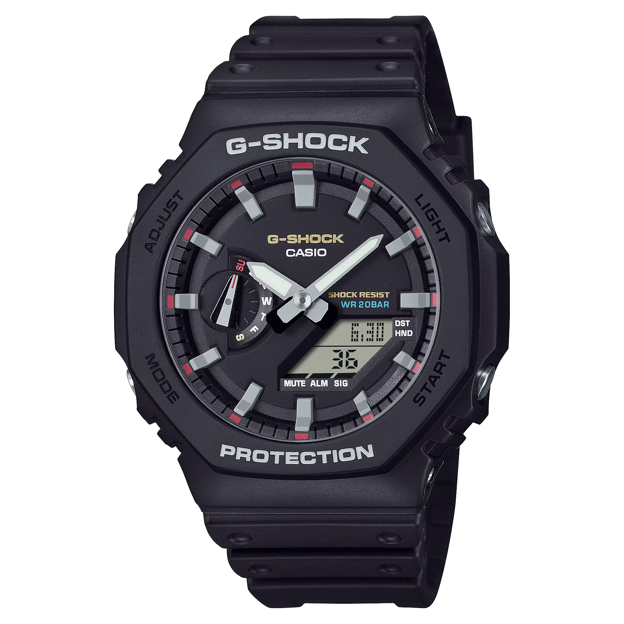 A simple and streamlined watch with octagonal bezel. The original color scheme is faithfully reproduced with touches of G-SHOCK red, representing the passion to take on challenges; blue, symbolizing excellent water resistance; and yellow, signifying outstanding shock resistance.