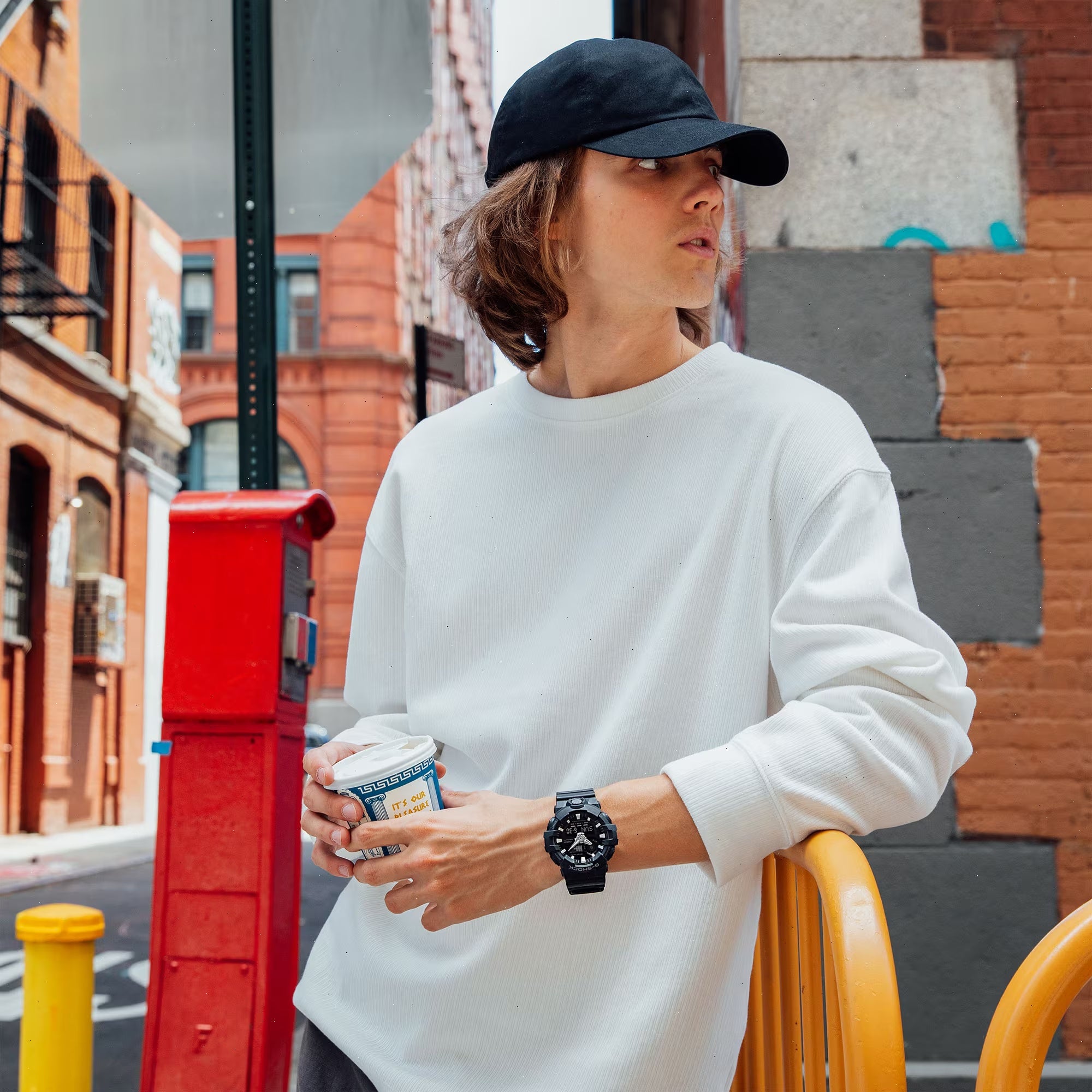 An analog-digital combination model with a front button, the iconic face of G-SHOCK symbolizing toughness, placed at the 6 o'clock position. Finished with dynamic styling that is both advanced and edgy.