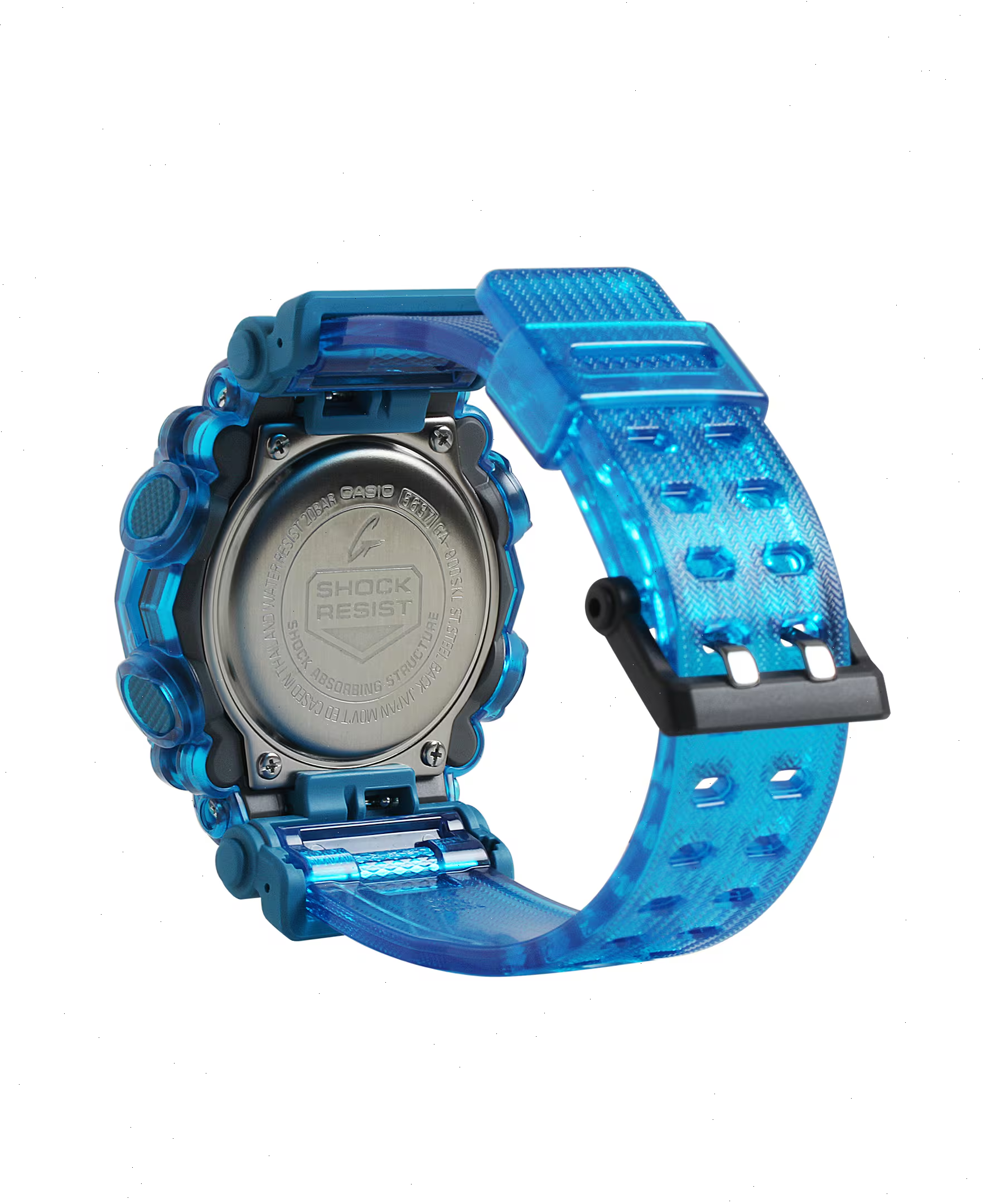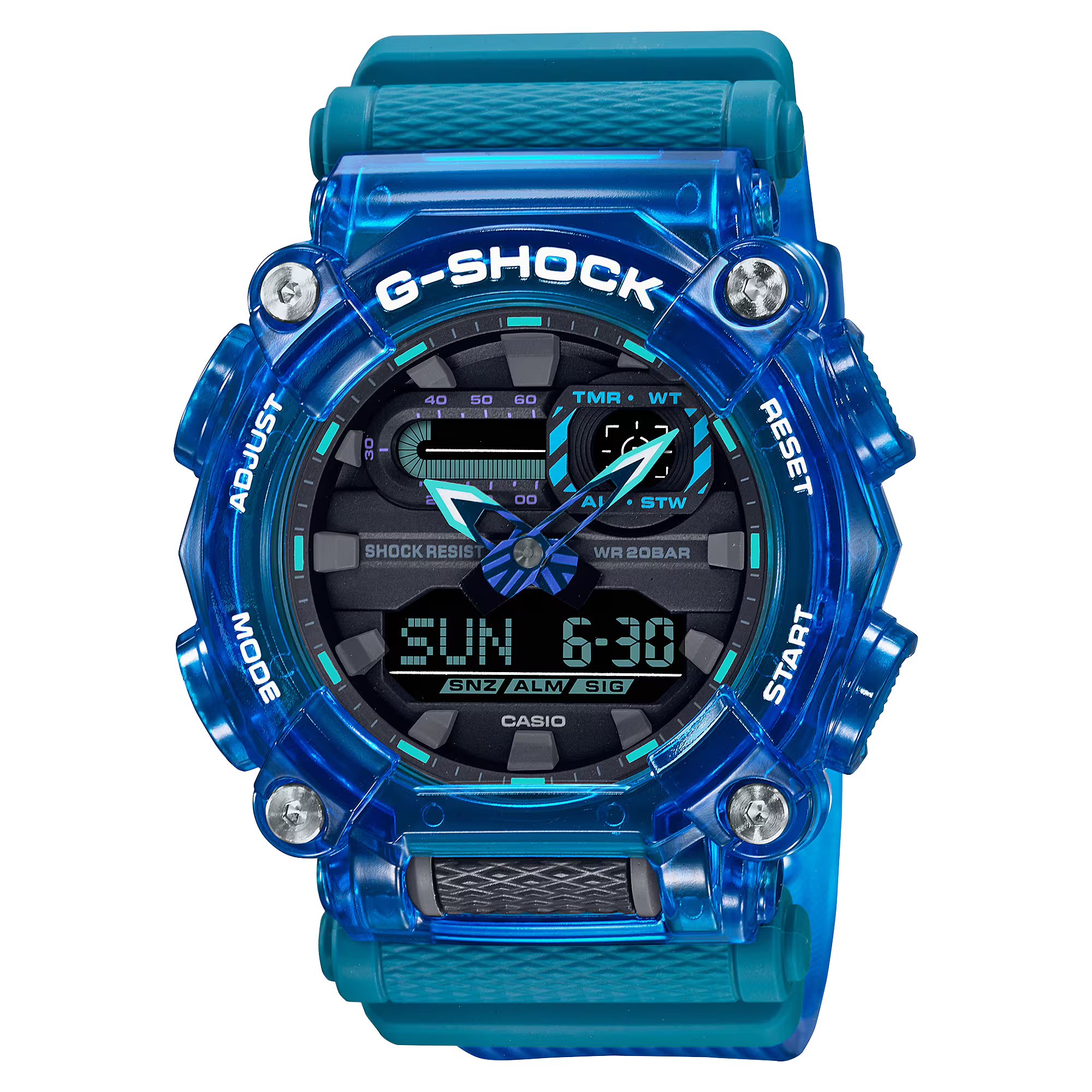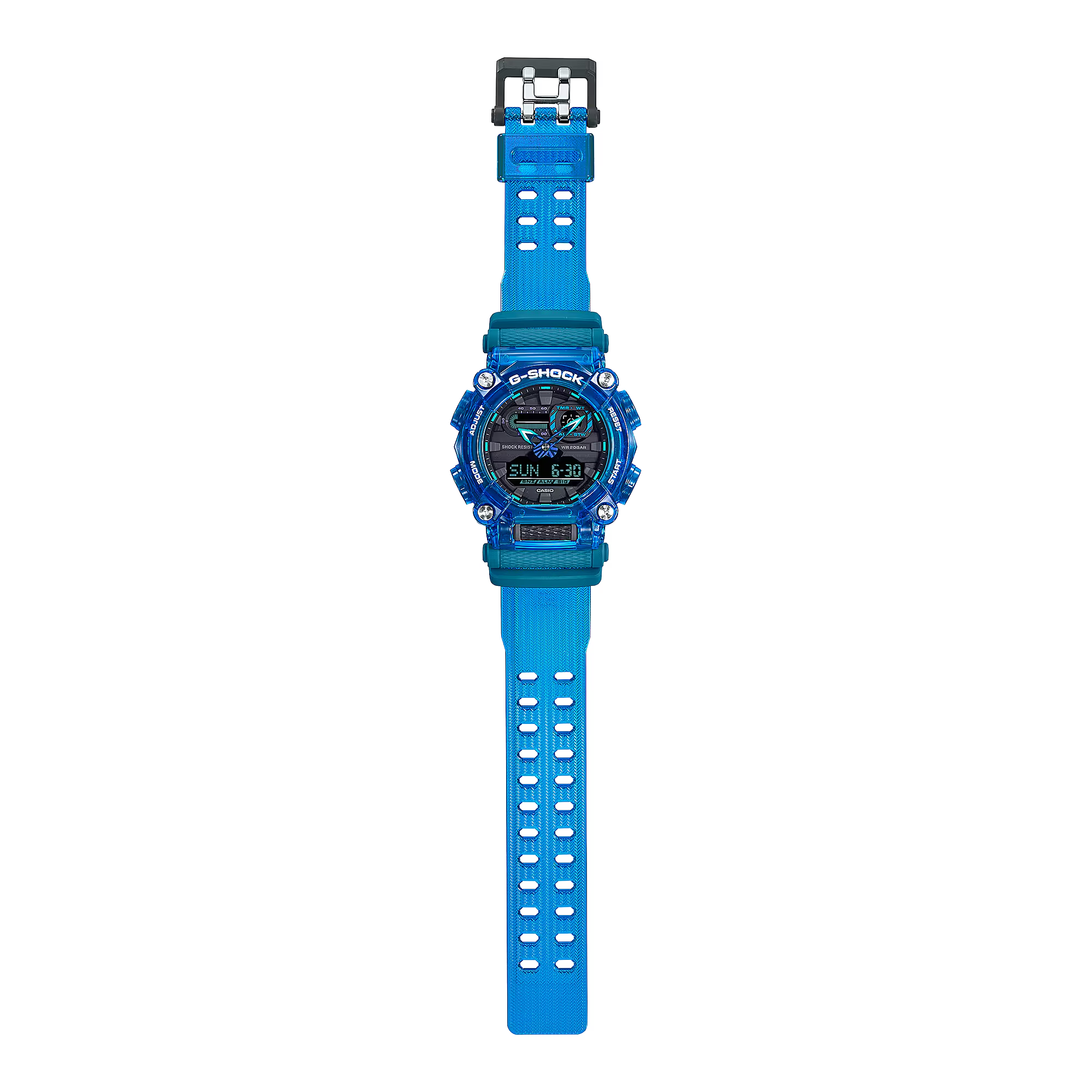 Inspired by a surge of sound flowing over a dance floor, these watches translate this vision into color and design for a stereophonic take on the rugged GA900 with its sturdy oversized case featuring analog hands and digital display.