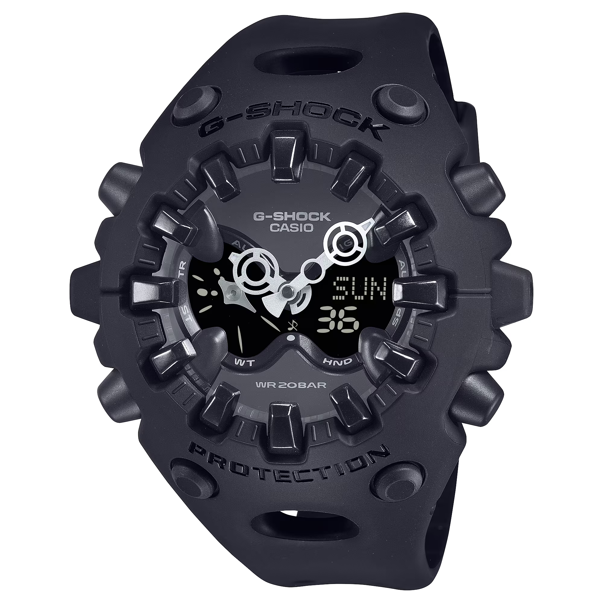 Expression should know no bounds: introducing the black G- SHOCK GAV01-1A. Showcasing a radical transformation in exterior design and module construction, the unique organic look and magnetic hand technology make this one cool watch.