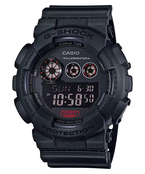 Touches of red and other colors provide great looking accents against the basic black of the cases, bands, digital displays, bezel lettering, and buttons. Base model is the GD-120 that features Super Illuminator and a 3-dial face.