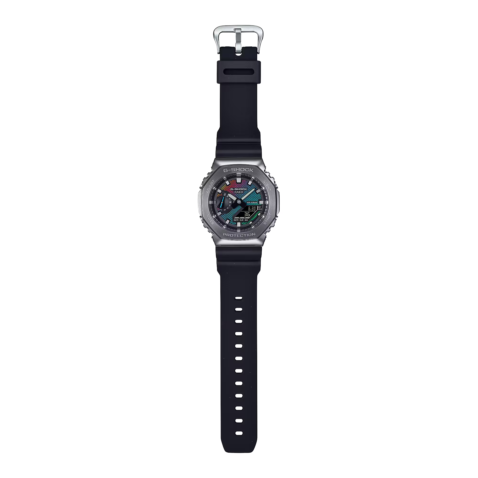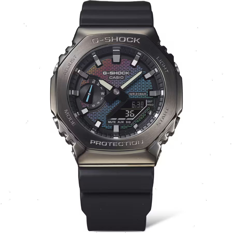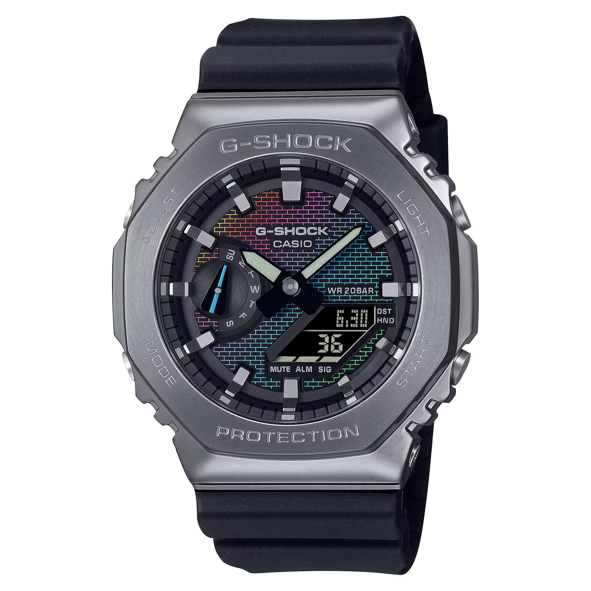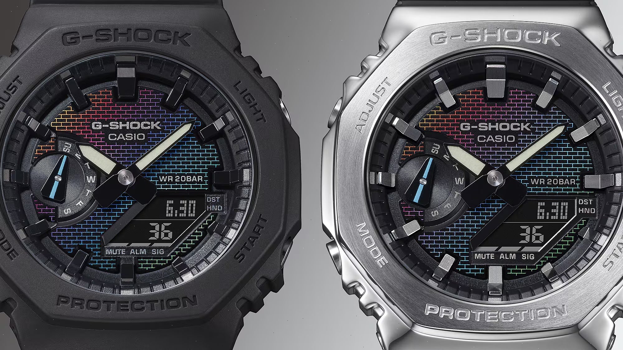 For the DW5600 and GM5600 models, the watch glass features the color-shifting brick pattern reproduced with vapor deposition in a rainbow-hued gradation. For the GA2100 and GM2100 models, the dial’s iridescent brick pattern is achieved with a combination of silver vapor deposition, laser etching, and rainbow-colored printing.
