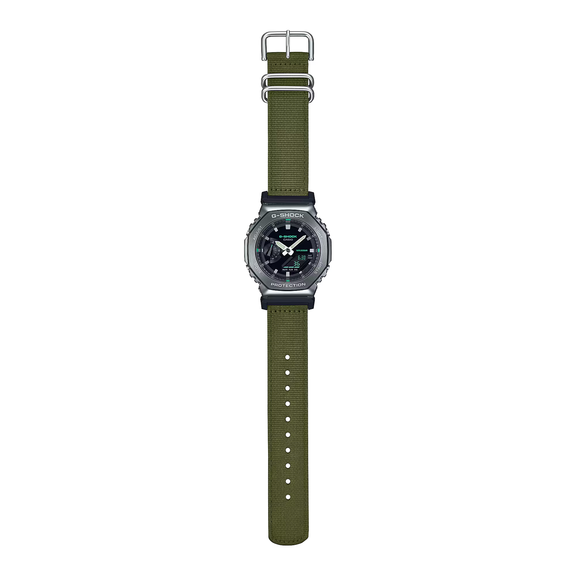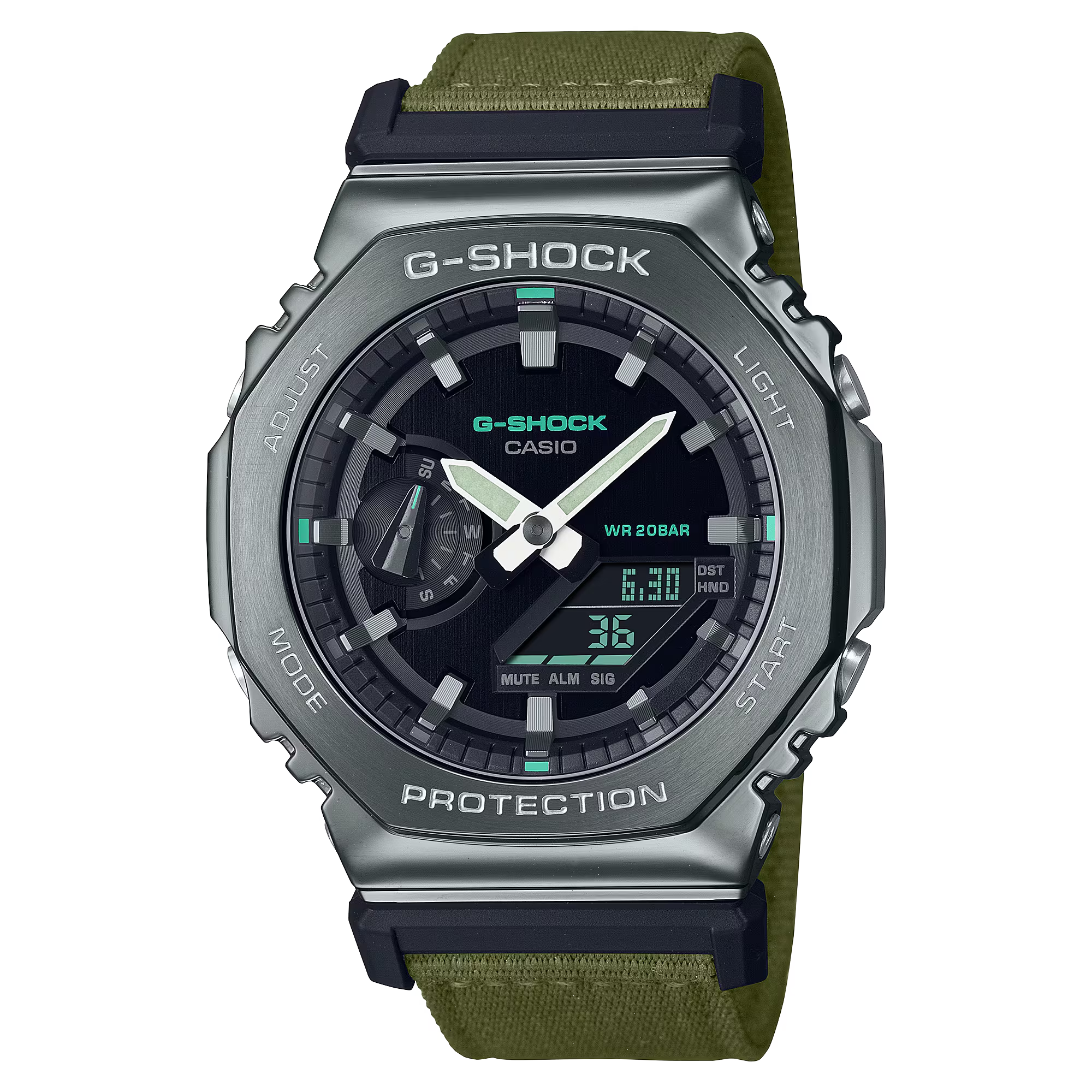 These innovative watches take the iconic octagonal form and metal-clad design of the GM-2100 line and pair it with a rugged fabric band in an utilitarian color that goes with any outfit.