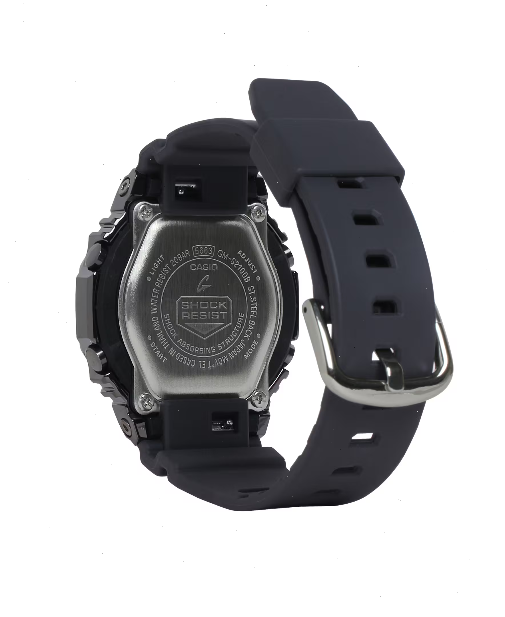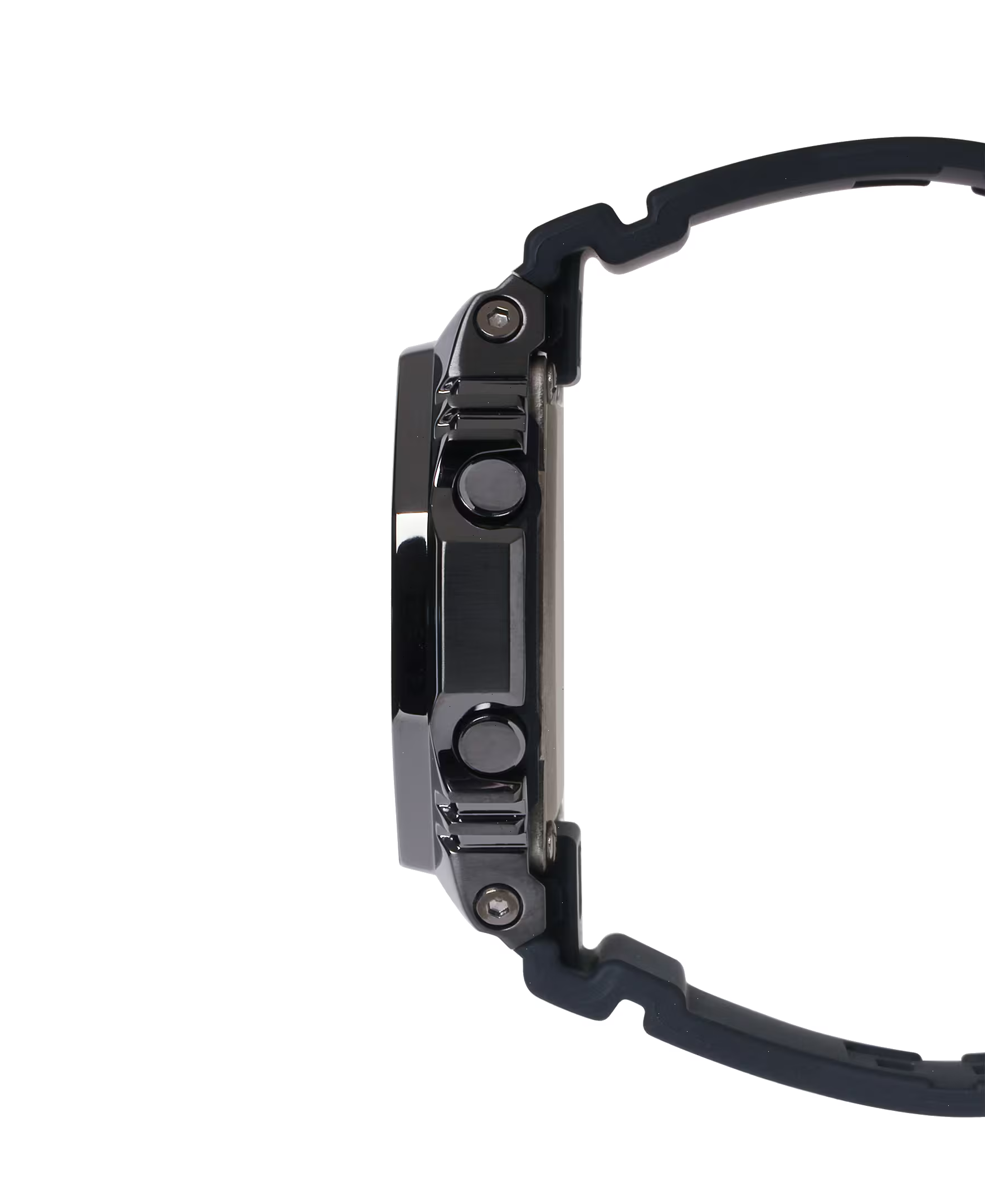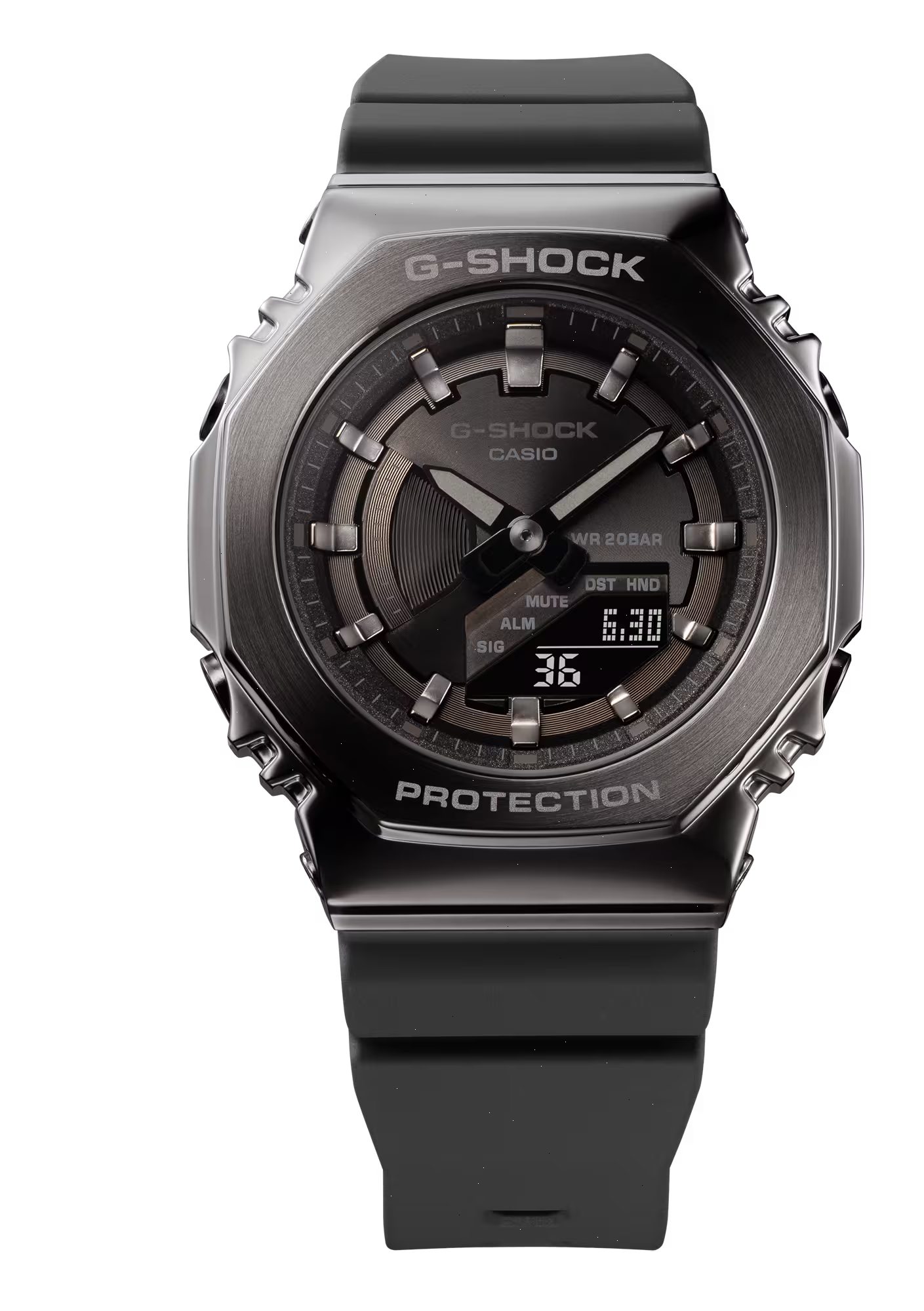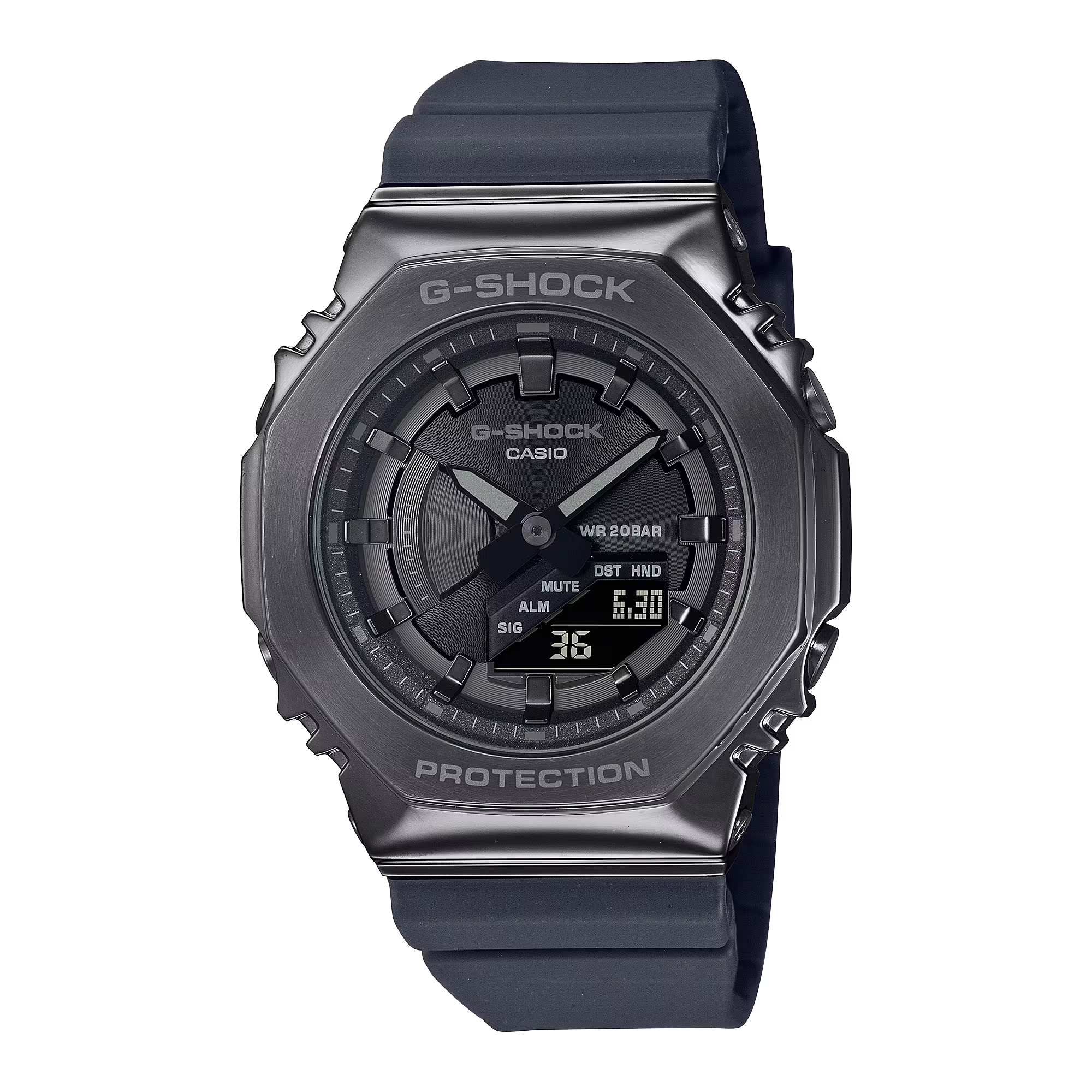 Go slim, clean and bold with a mid-sized black resin band GMS2100B-8A in a metal-clad octagonal take on the original iconic design.