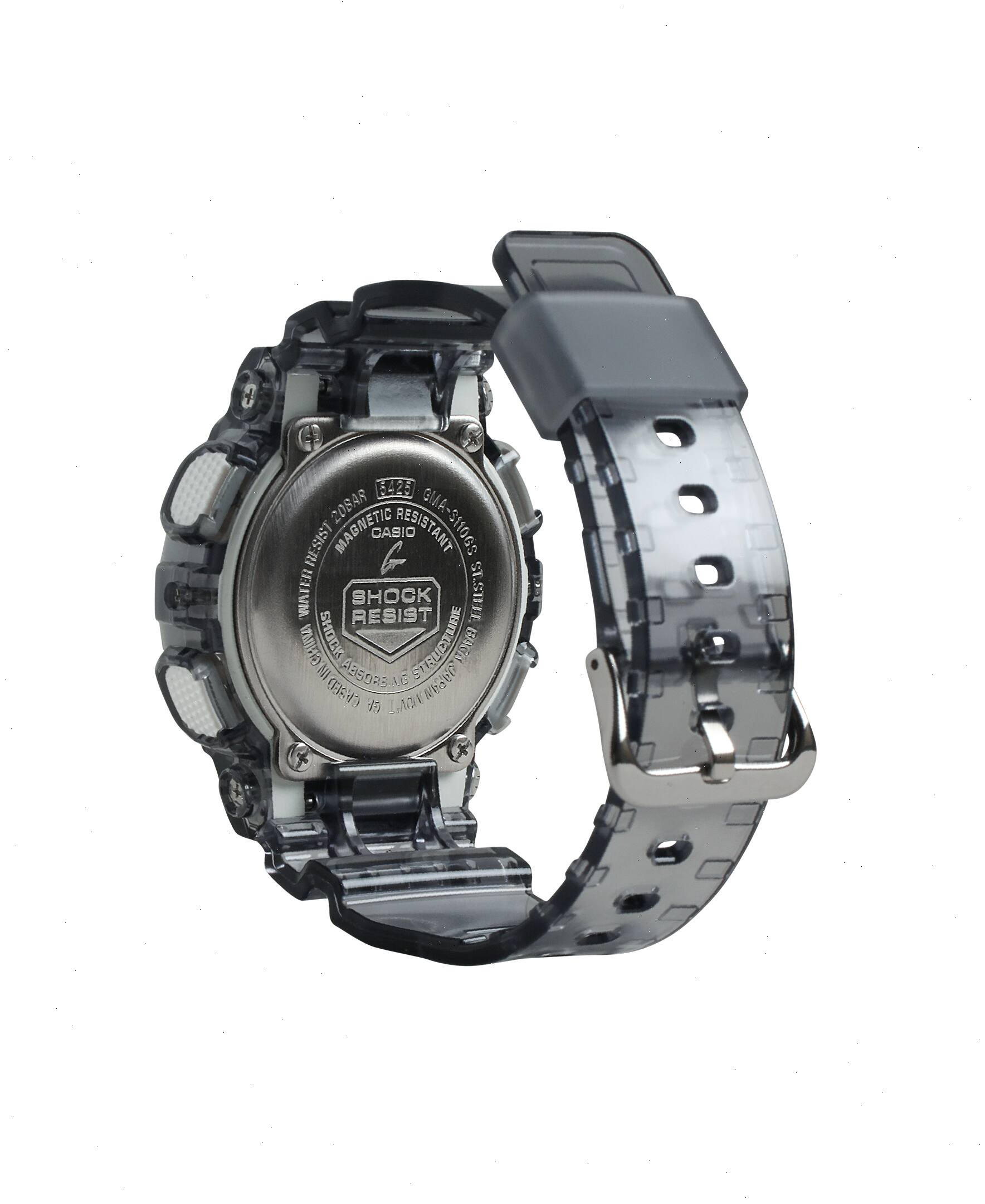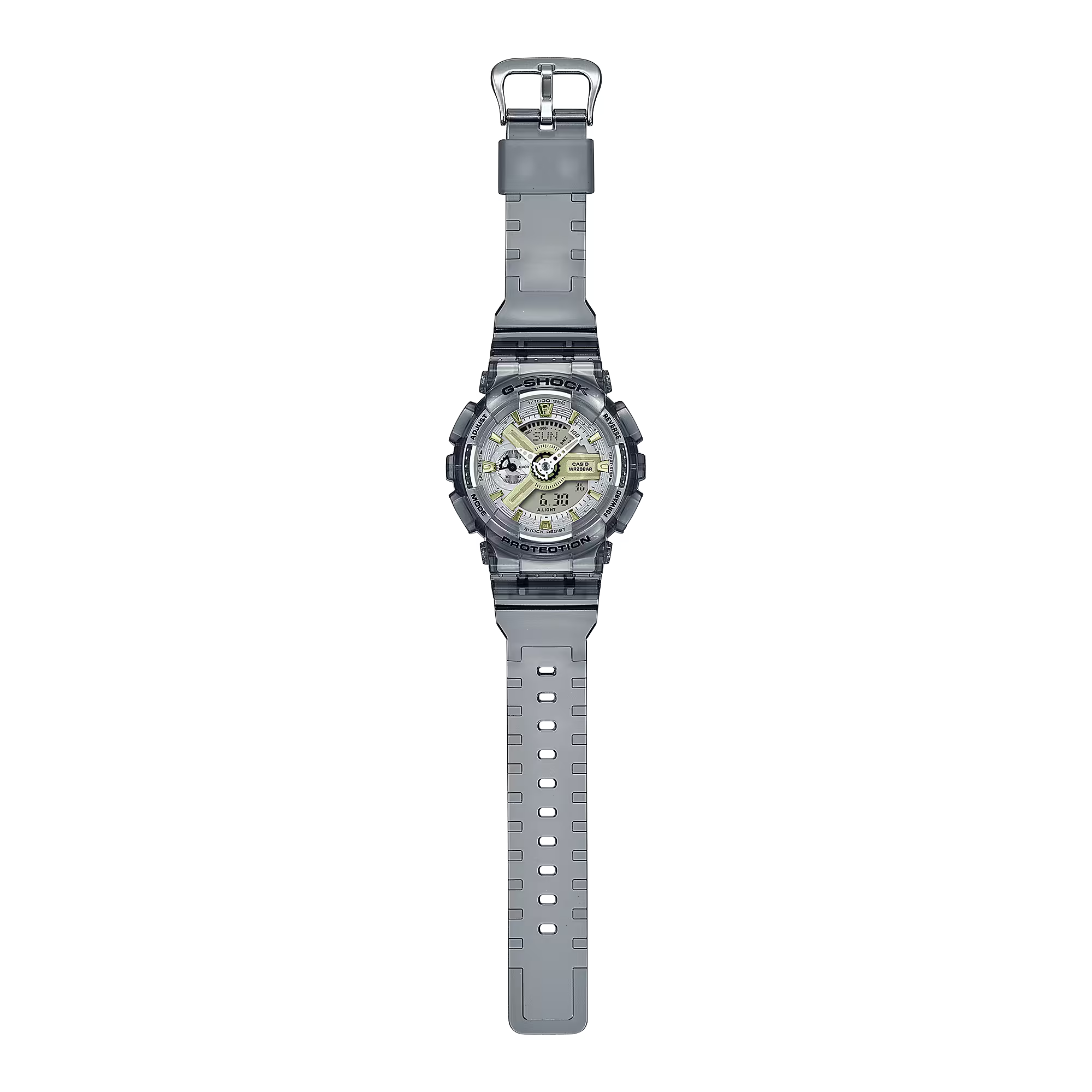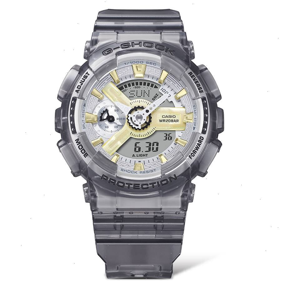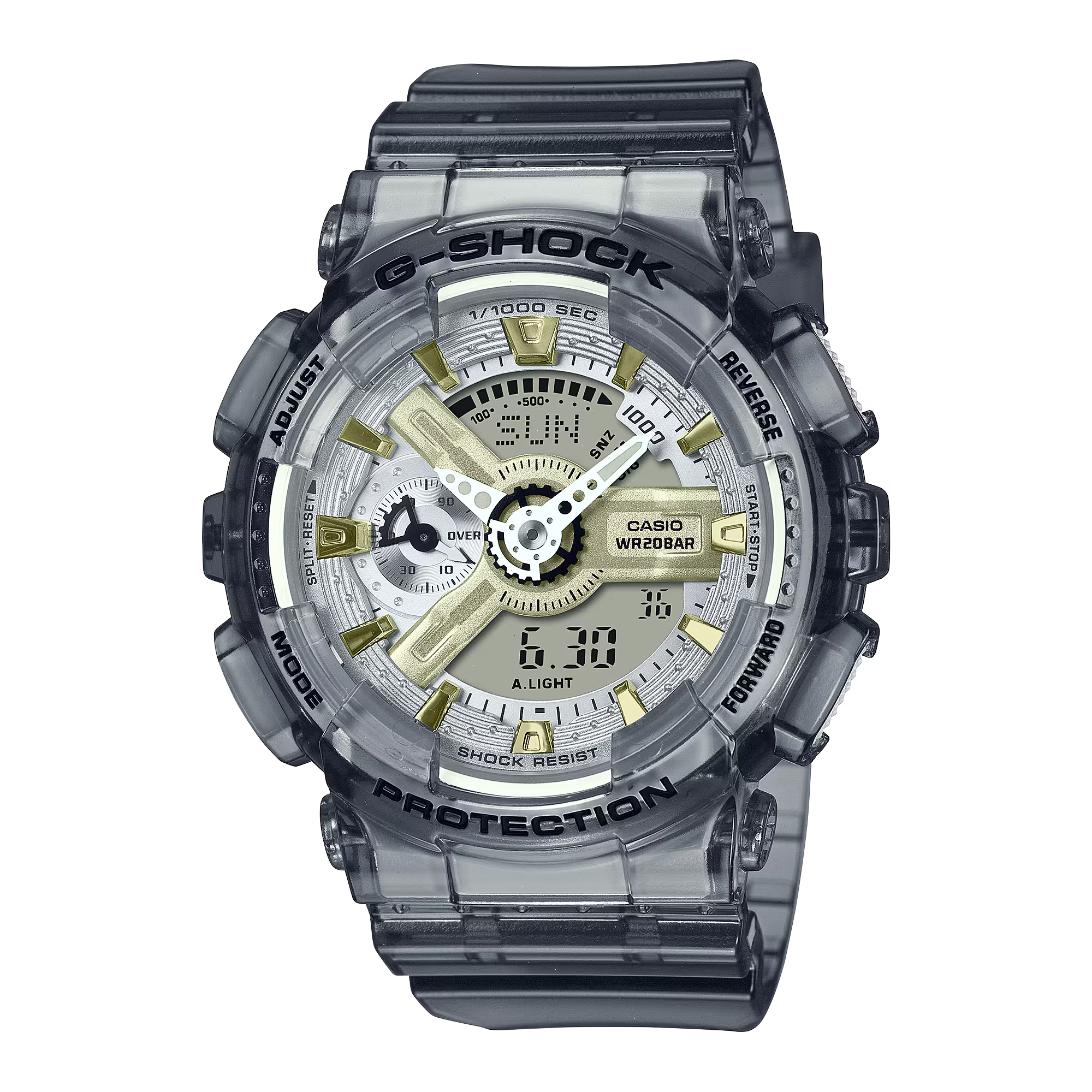 A metallic shine with a modern twist, the new GMAS110GS is slightly smaller for a refined fit on slimmer wrists. This compact design is based on the popular GA110 and brings metallic translucence to the ever-popular analog-digital G-SHOCK design. Gray semi-transparent resin is combined with dial components in matte and mirrored gold tones for balanced, fluid, contemporary style. The GMAS110GS-8A is the perfect fit for fashionable, trend-setting youths..