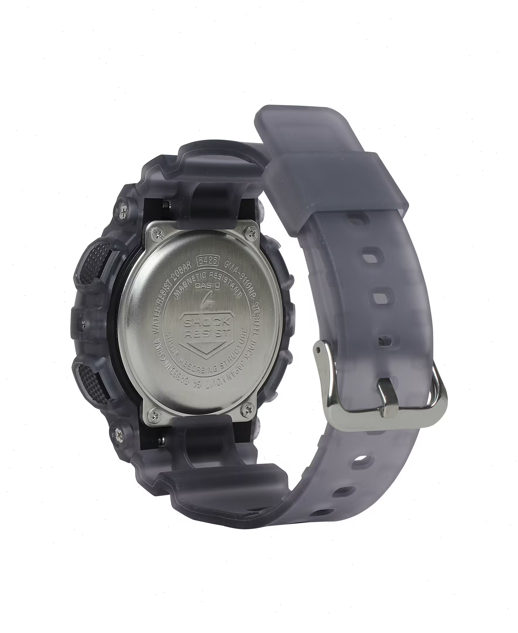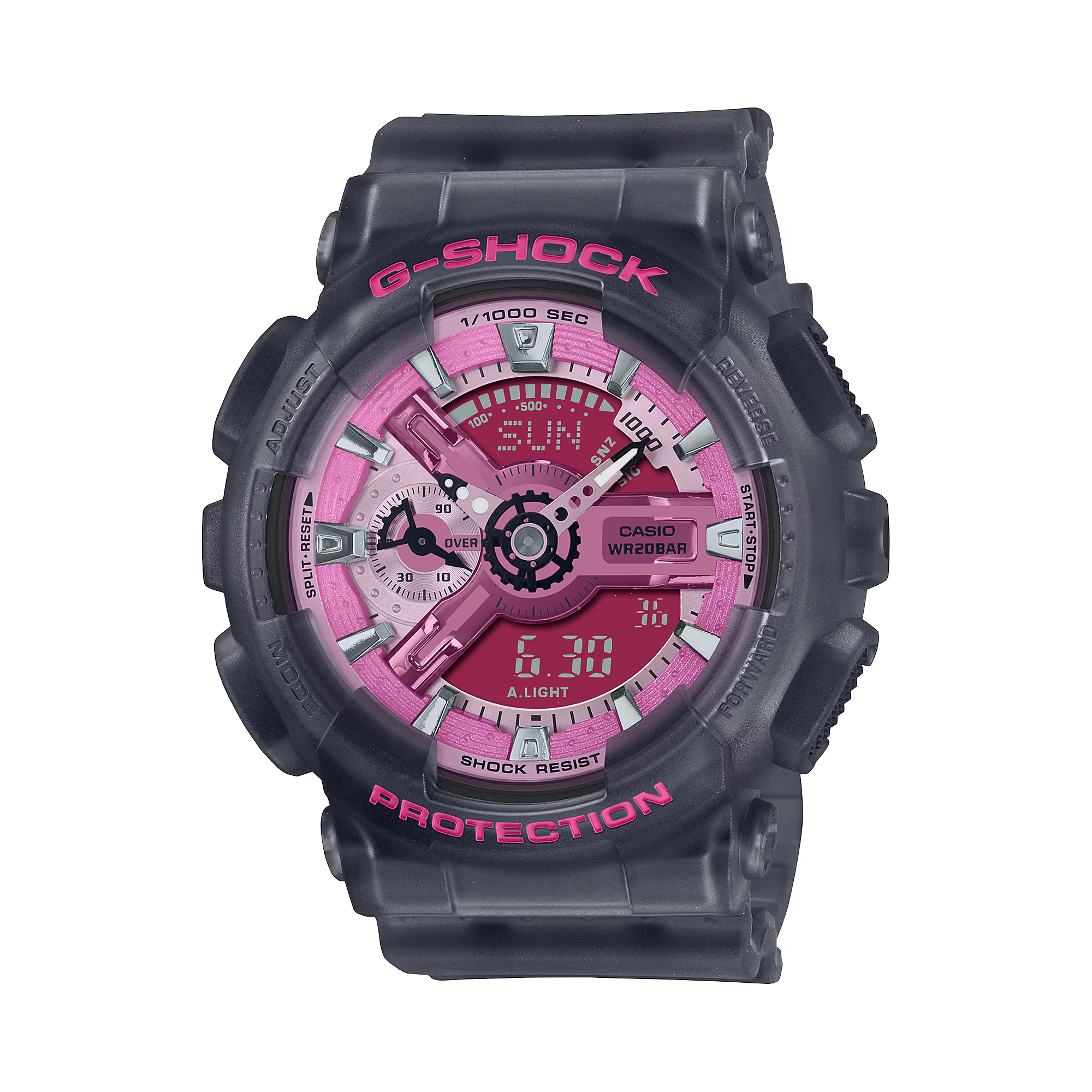 The new GMAS110NP-8A was created by reducing the size of the popular digital-analog G-SHOCK GA110 and then dressing it up with fashionable neo-punk designs. Metal parts and metallic studs combine with soft pastel colors for the case, band, and inset dial, resulting in both forceful yet delicate designs. The GMA-S110NP-8A has a dark gray semi-transparent case and band accented by bright pink face colors.