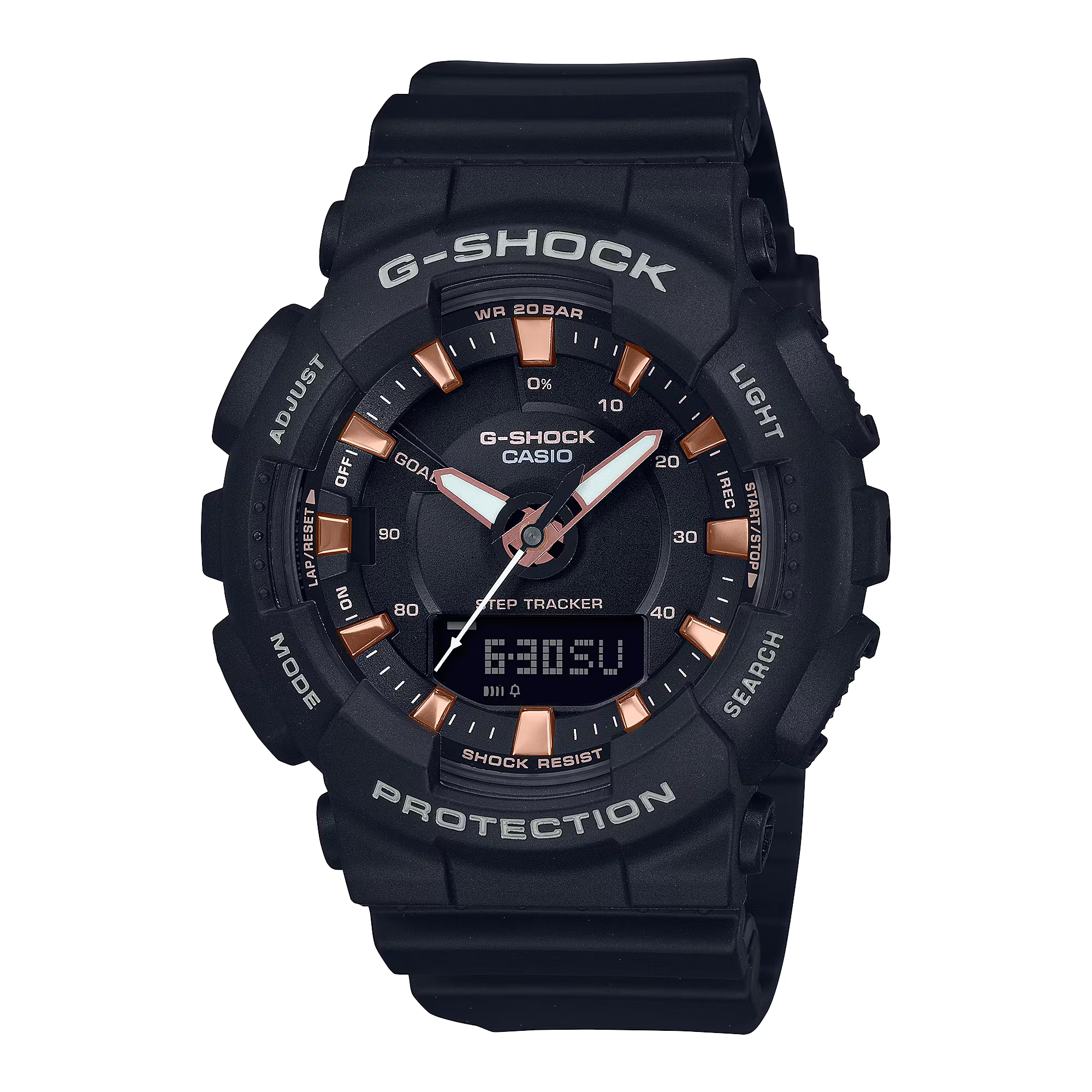 A popular digital-analog combination model equipped with a pedometer for a sporty design. The entire watch is in subdued black, with pink gold accents on the indices and hour and minute hands.