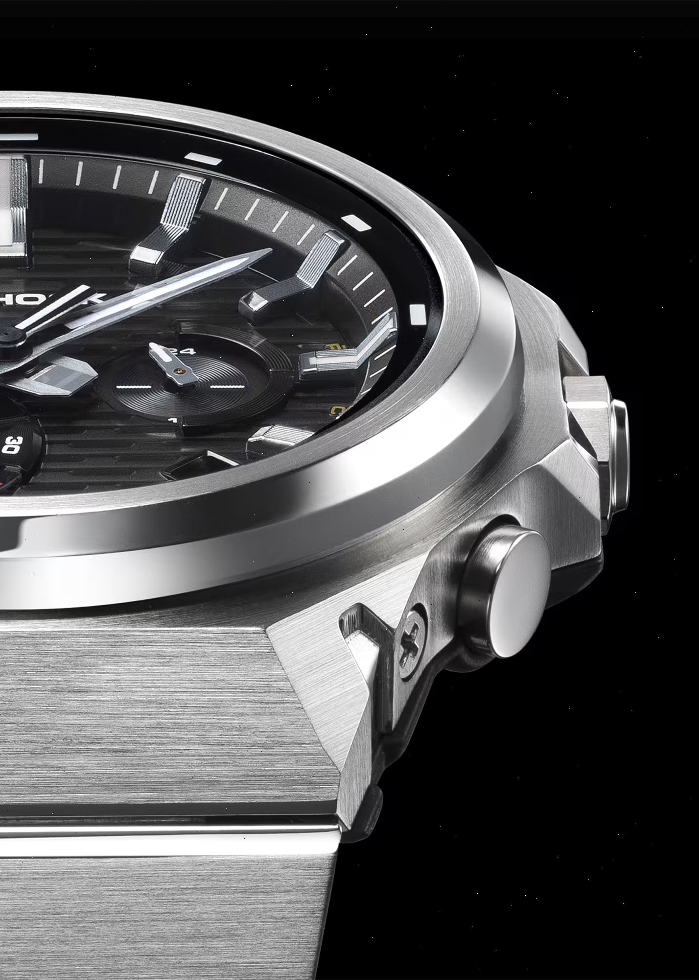 The bezel goes logo-free for a clean, modern look, while three separate finishes — vertical hairline, circular hairline, and mirror polishing — create a rich and sophisticated textural appeal that changes as light is reflected at different angles. The mirror- and hairline-finished solid stainless-steel band is paired with a tri-fold clasp also crafted from solid stainless steel. This sharp, flat design takes you from business meetings to casual settings to outdoor activities with ease.