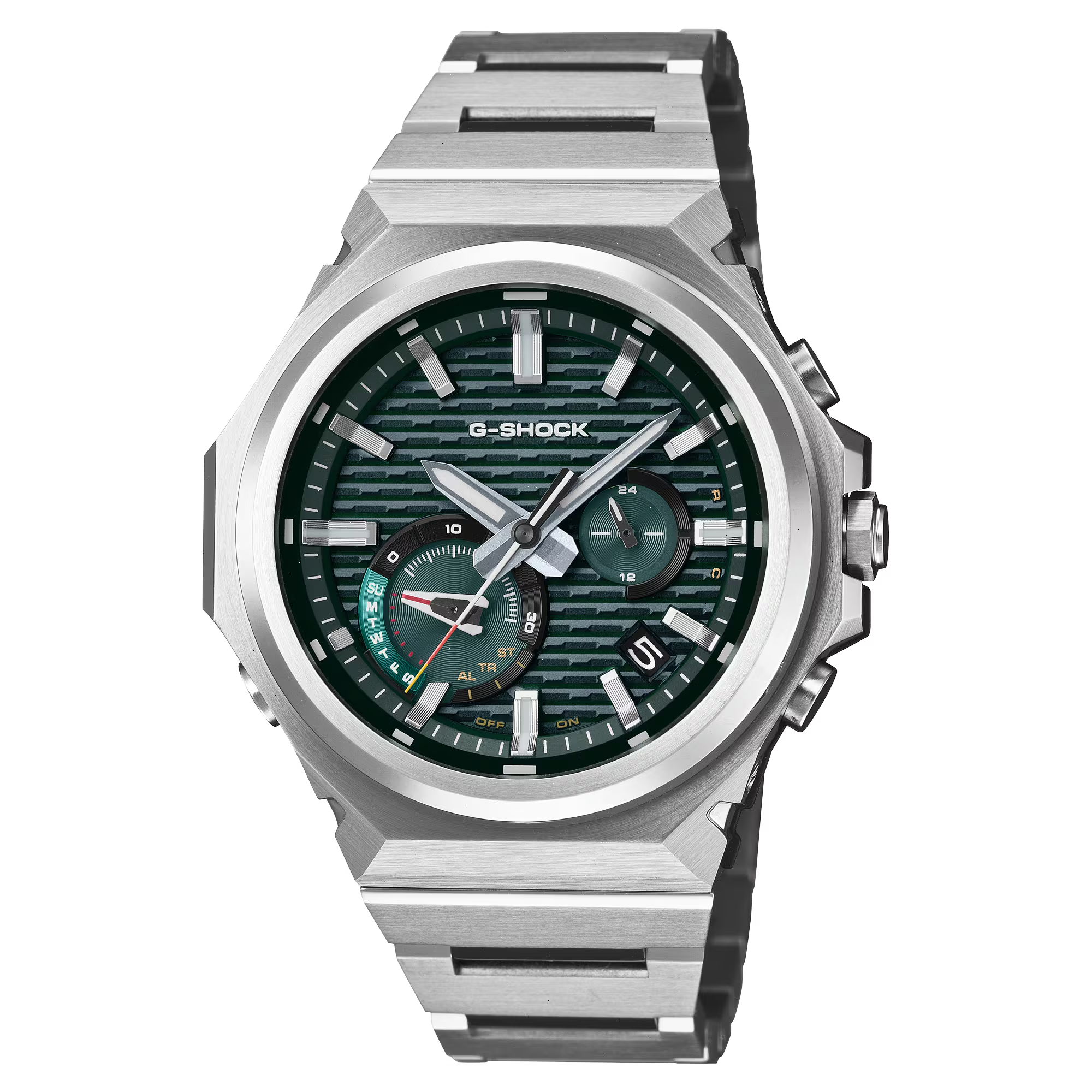 The bezel goes logo-free for a clean, modern look, while three separate finishes — vertical hairline, circular hairline, and mirror polishing — create a rich and sophisticated textural appeal that changes as light is reflected at different angles. The mirror- and hairline-finished solid stainless-steel band is paired with a tri-fold clasp also crafted from solid stainless steel. This sharp, flat design takes you from business meetings to casual settings to outdoor activities with ease.