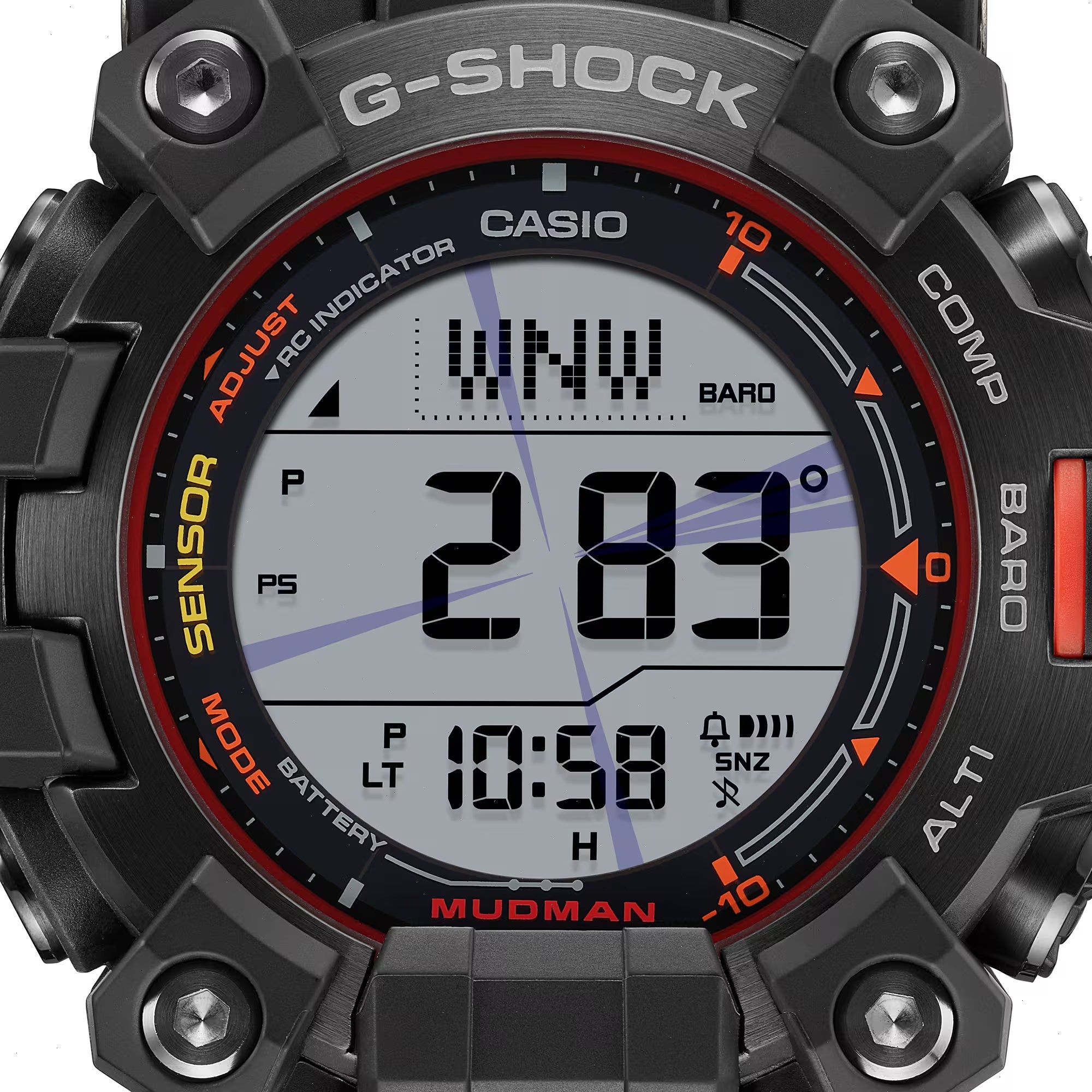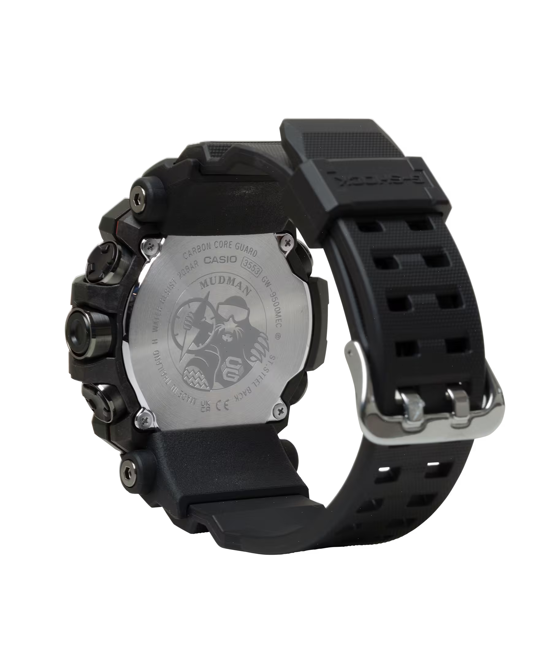 The MUDMAN GW9500MEC not only features a dust, mud, and shock-resistant structure, but also delivers radio-controlled, solar-powered functionality. The digital compass display with improved readability employs a duplex LCD for greater practical utility. Stainless steel for the bezel components and black ion plating complete the watch’s intrepid look.