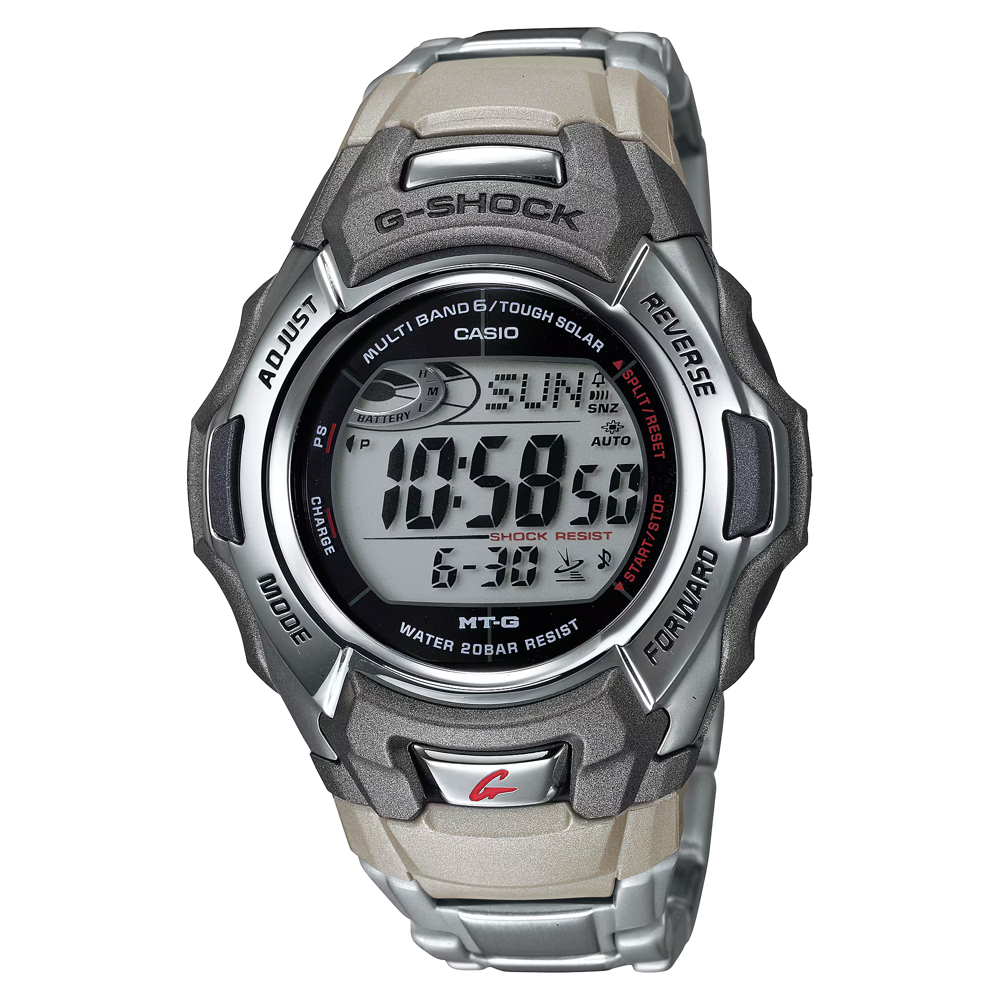 Built to endure, the G-SHOCK MTG-M900DA-8 showcases toughness at its core. Its robust silver stainless steel band withstands the rigors of daily wear while maintaining its stylish charm. The neutral digital face houses a practical countdown timer, replacing the time memo function of the previous model, and adds a layer of versatility to your time management. With its blend of toughness, solar atomic accuracy, and sleek stainless steel design, the MTG-M900DA-8 is more than just a timepiece—it's a statement of durability and style.