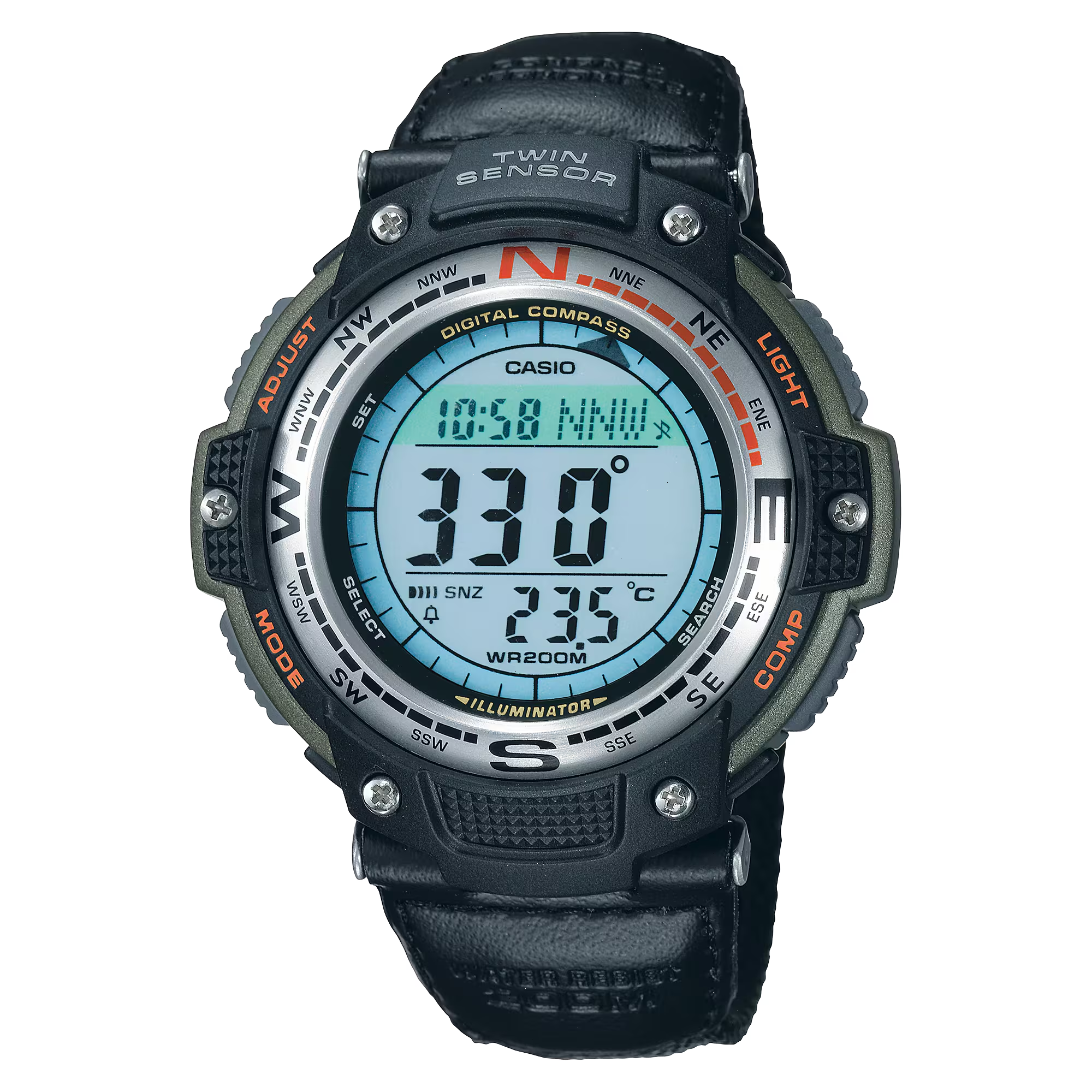 This model pack Twin Sensor temperature and direction readings into a 200-meter water resistant design that is perfect for sports, work, or other activities that involve water. In addition to world time, stopwatch, alarm and other basic timekeeping functions, this model also include a direction sensor and temperature sensor. Direction readings and time are indicated by large, easy-to-read figures. A large LCD is divided into three segments for a clear, easy-to-understand presentation of data. Mineral glass is used to protect against scratching.